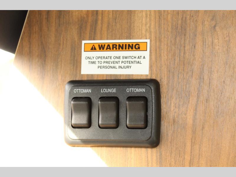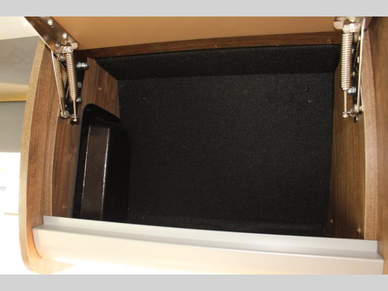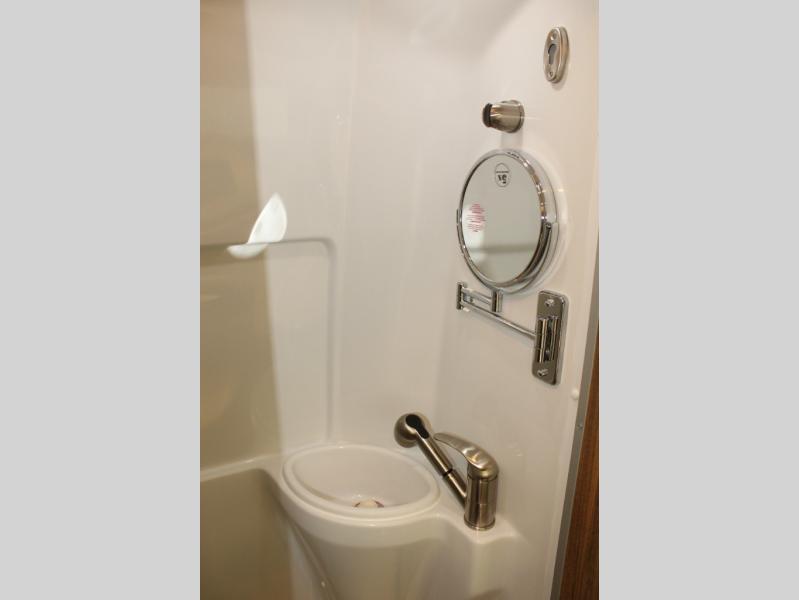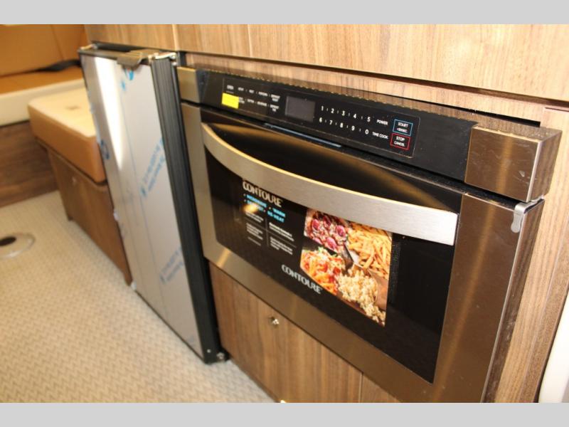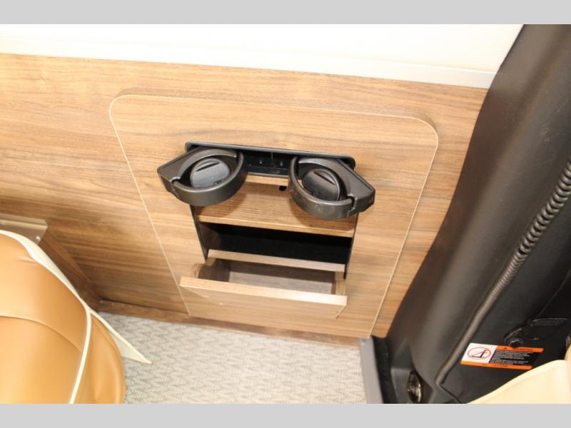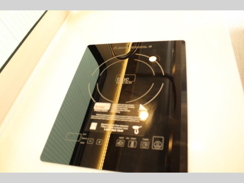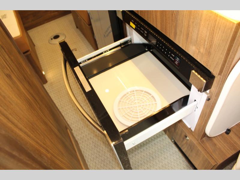 This motorhome is ready to take everyone to each destination in comfort and style! You can even stay overnight without booking a hotel room and stay squeaky clean with a wet bath that has a one-piece shower, a riveted aluminum porthole door, a toilet, a sink with an articulated mirror, a towel rack, and even a retractable clothesline. Keep your bellies full with the single-burner induction cooktop, the drawer-style microwave and the 3.1 cu. ft. refrigerator under the Corian counter. The rear power sofa is not only great for sitting on during the day, but also for sleeping on at night once it is folded down to turn the entire rear of the unit into a singular sleeping space. In between the two captain's chairs and the two side seats is a removable table to play games and eat meals!