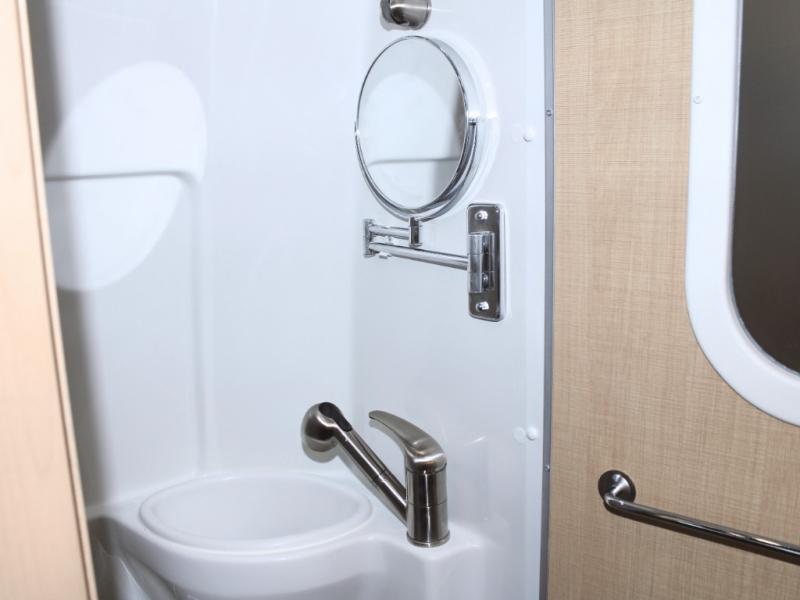 The spa-inspired wet bath includes a riveted aluminum porthole door, one-piece shower, toilet, sink with articulated mirror, towel rack, and even a retractable clothesline—the perfect combination of form and function.