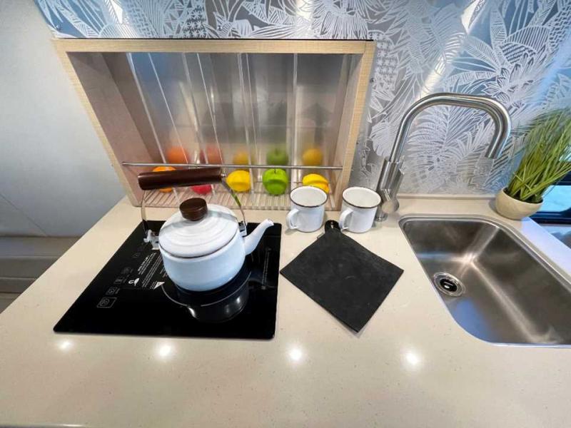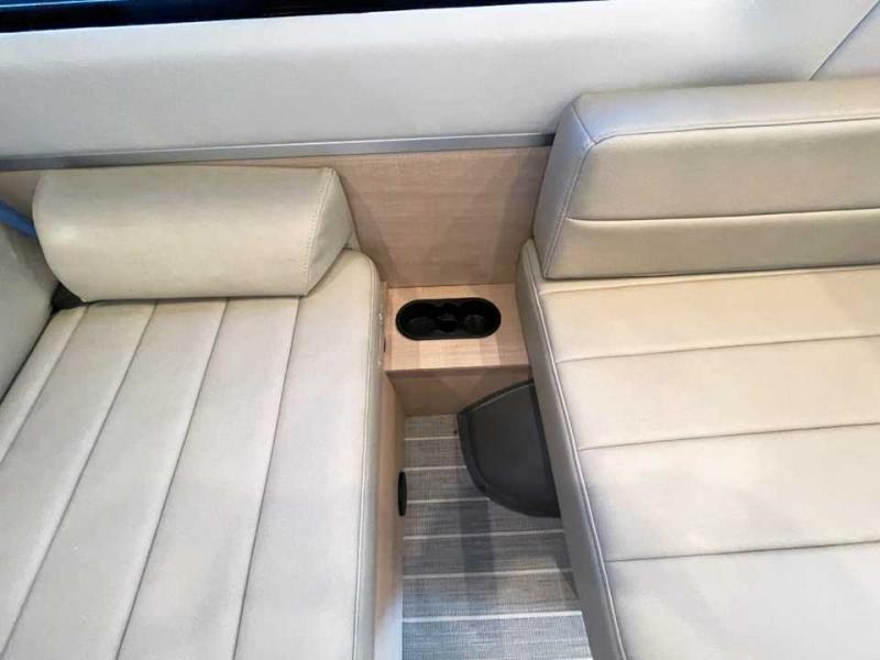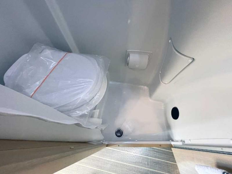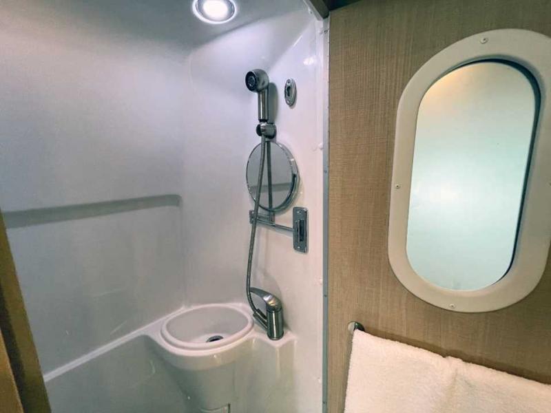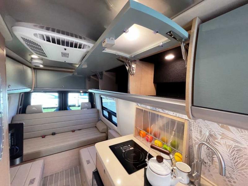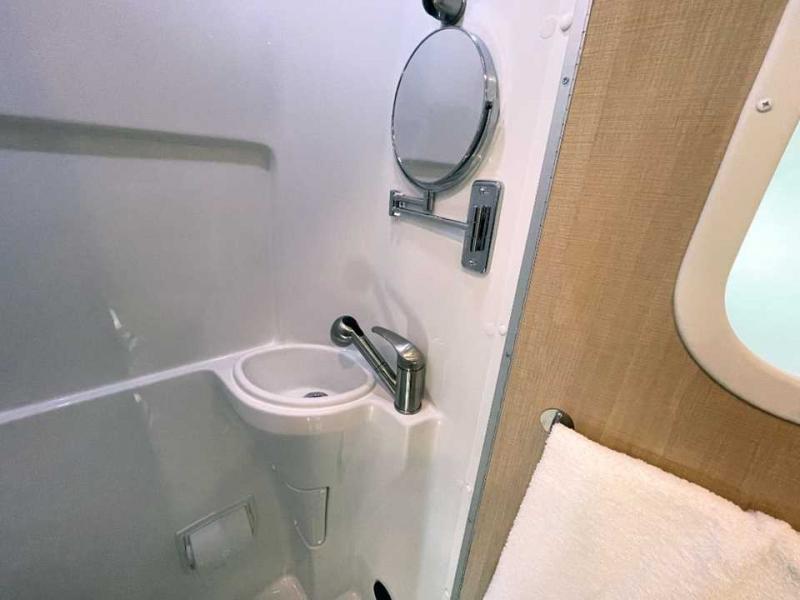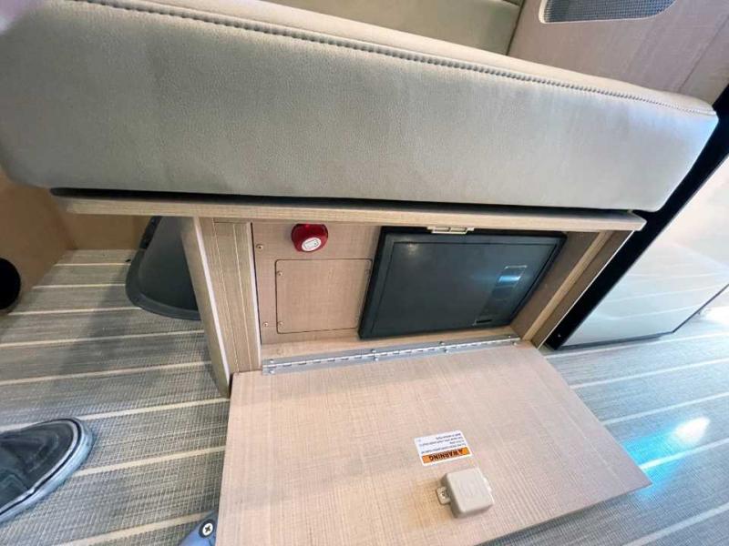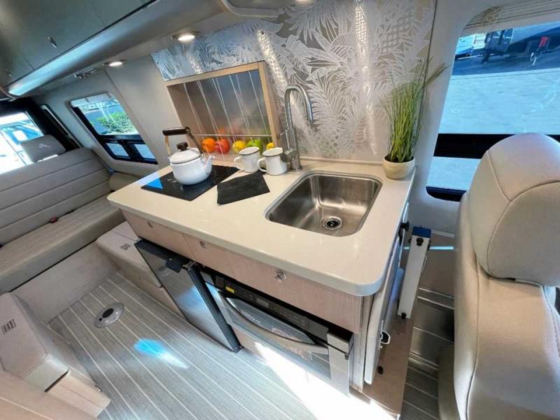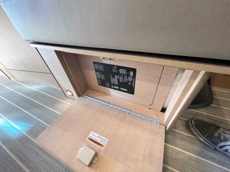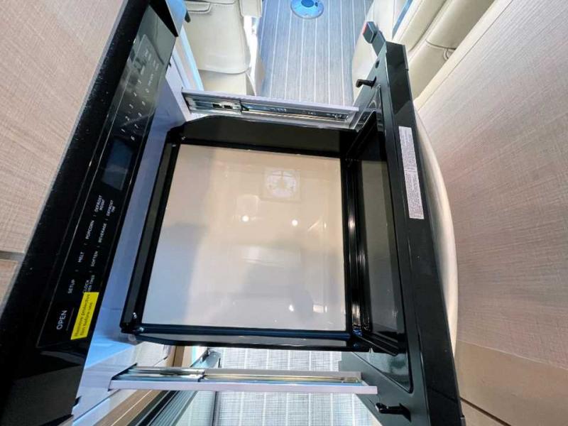 This motorhome is ready to take everyone to each destination in comfort and style! You can even stay overnight without booking a hotel room and stay squeaky clean with a wet bath that has a one-piece shower, a riveted aluminum porthole door, a toilet, a sink with an articulated mirror, a towel rack, and even a retractable clothesline. Keep your bellies full with the single-burner induction cooktop, the drawer-style microwave and the 3.1 cu. ft. refrigerator under the Corian counter. The rear power sofa is not only great for sitting on during the day, but also for sleeping on at night once it is folded down to turn the entire rear of the unit into a singular sleeping space. In between the two captain's chairs and the two side seats is a removable table to play games and eat meals!