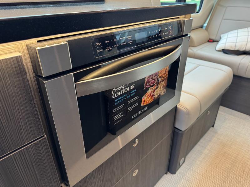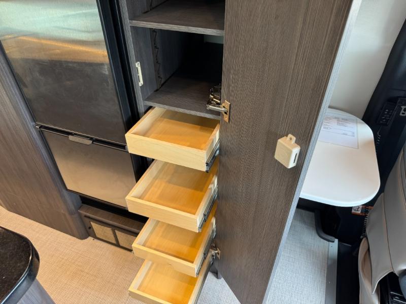 Get ready to drive and stay in comfort and luxury in this motorhome with everything you need and everything you didn't even know you wanted! The heated driver and passenger seats swivel to face the interior living space allowing you to utilize the Corian countertop with an LED TV above to place your beverages, and the driver can use this as a desk to work from here once stopped. Whip up a meal using the galley kitchen featuring a two-burner gas stove, and a large stainless steel sink and faucet, plus extra counter space for food prep. There is a 1.2 cu. ft. drawer microwave and deep drawers for storage, plus a slide-out pantry and a refrigerator with a freezer across from the sink. The power sofa in the rear can be fully flat with a push of a button so two can sleep or rest. And there is storage throughout for your hanging clothes, towels, luggage, dishes and more.