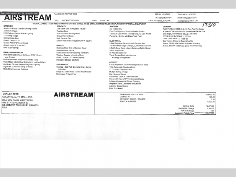 Airstream Rangeline Class B motor home Std. Model highlights: