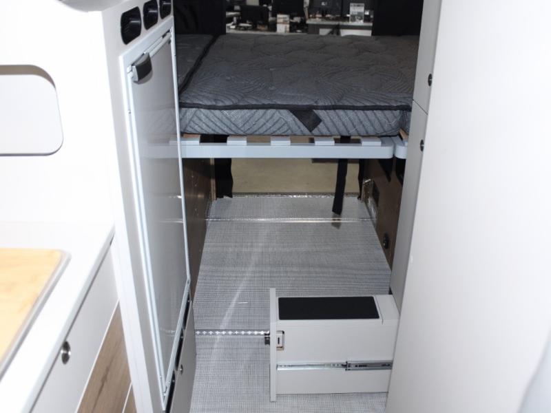 Cooking on the go is a breeze with a fully equipped galley kitchen, and the wet bath offers convenience and cleanliness wherever you are. With ample rear storage, including MOLLE panels and under-bed cargo space, you’ll have room for gear, groceries, and adventure essentials. Want to bring more people? Add the optional pop-top roof with an additional bed and three screen windows for light, ventilation, and sleeping space for up to four.