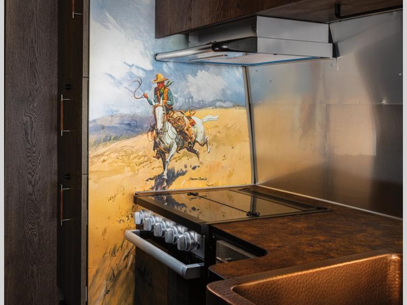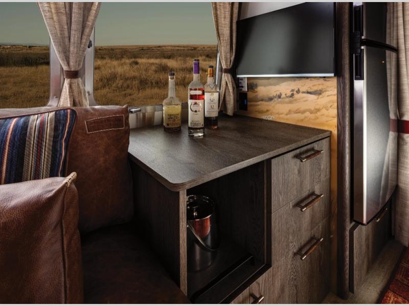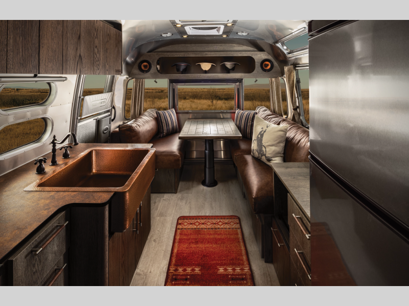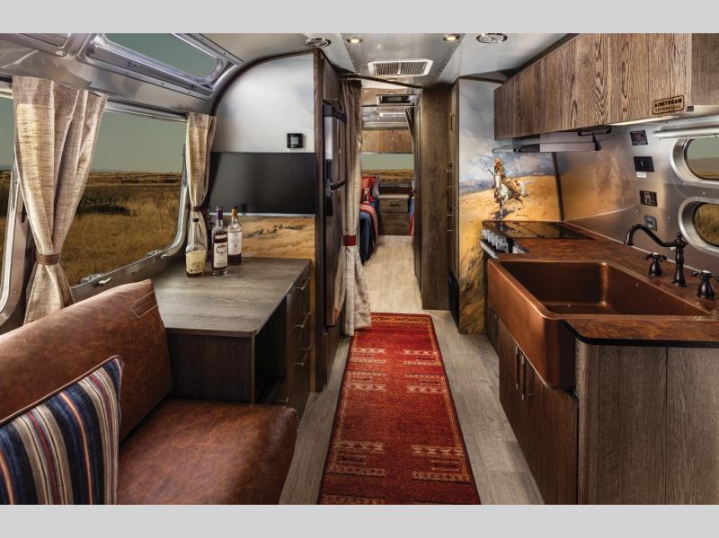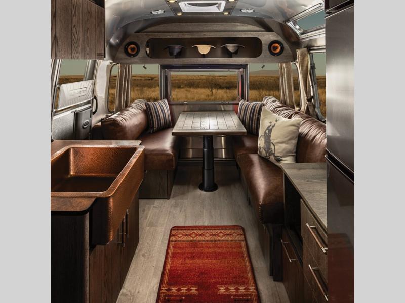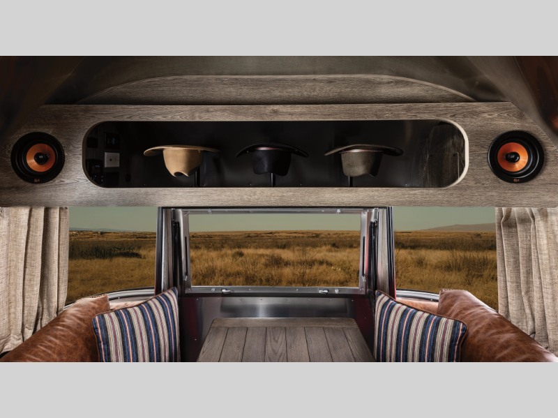 Airstream has collaborated with the hatmakers of Stetson and the Four Sixes Ranch in Texas to bring you the Stetson + 6666 Special Edition travel trailer! You will find Western heritage and modern luxury throughout with genuine leather, convenient hat racks, premium finishes, and handcrafted cabinetry. You will love the rear hatch that opens to give you fresh air and wide-open views of the pasture, and there is a sliding pull-down screen to keep bugs out in the evening. The galley and lounge walls feature custom laminate artwork drawn from Stetson's archive, and the leather cabinet hardware adds subtle Western style you are sure to enjoy. Outside, you'll find a 300-watt solar charging system, a backup camera, insulated and heated tanks, and a SmartPlug 50 Amp power cord to name just a few conveniences!