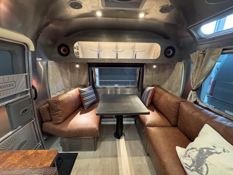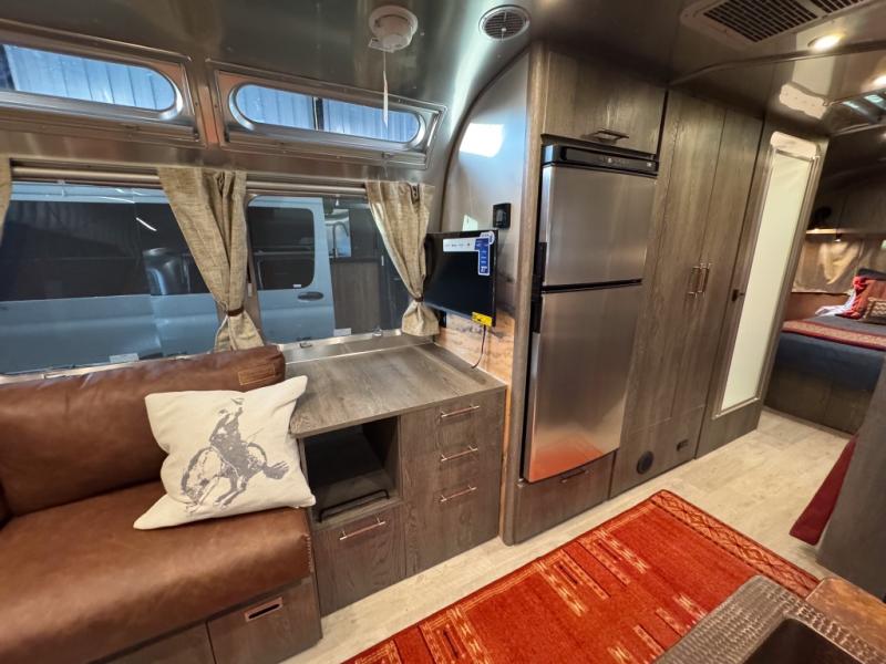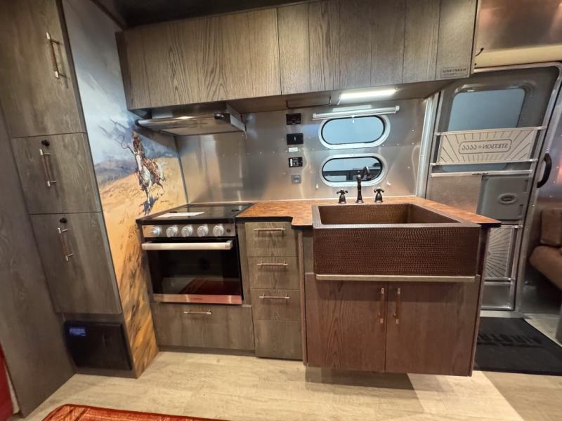 Airstream has collaborated with the hatmakers of Stetson and the Four Sixes Ranch in Texas to bring you the Stetson + 6666 Special Edition travel trailer! You will find Western heritage and modern luxury throughout with genuine leather, convenient hat racks, premium finishes, and handcrafted cabinetry. You will love the rear hatch that opens to give you fresh air and wide-open views of the pasture, and there is a sliding pull-down screen to keep bugs out in the evening. The galley and lounge walls feature custom laminate artwork drawn from Stetson's archive, and the leather cabinet hardware adds subtle Western style you are sure to enjoy. Outside, you'll find a 300-watt solar charging system, a backup camera, insulated and heated tanks, and a SmartPlug 50 Amp power cord to name just a few conveniences!
