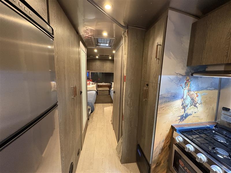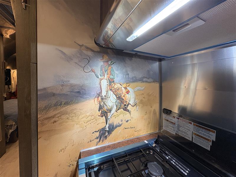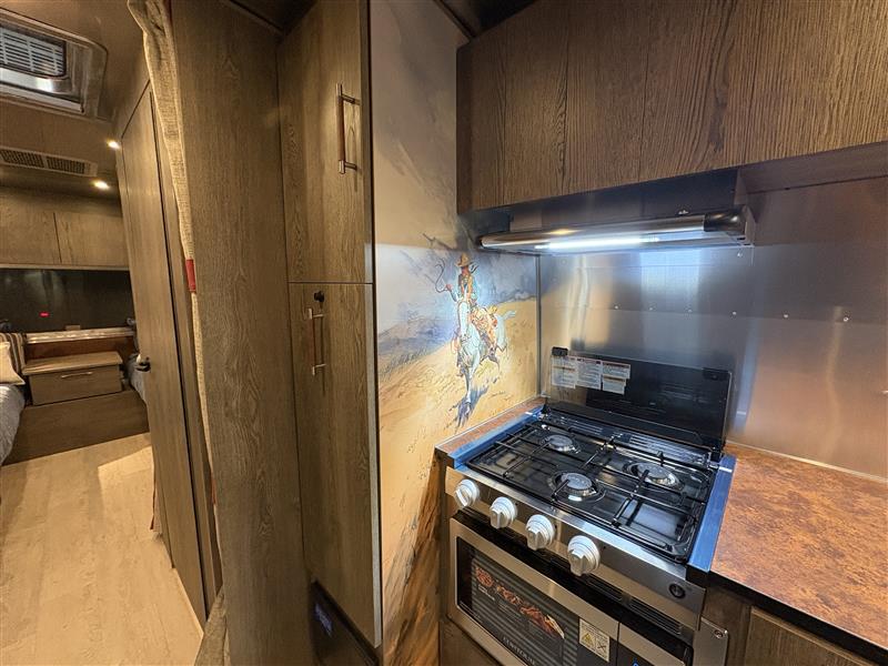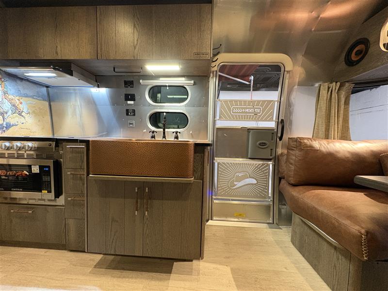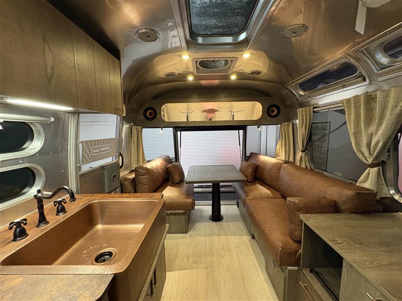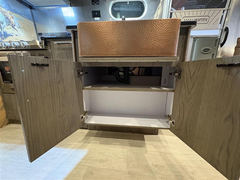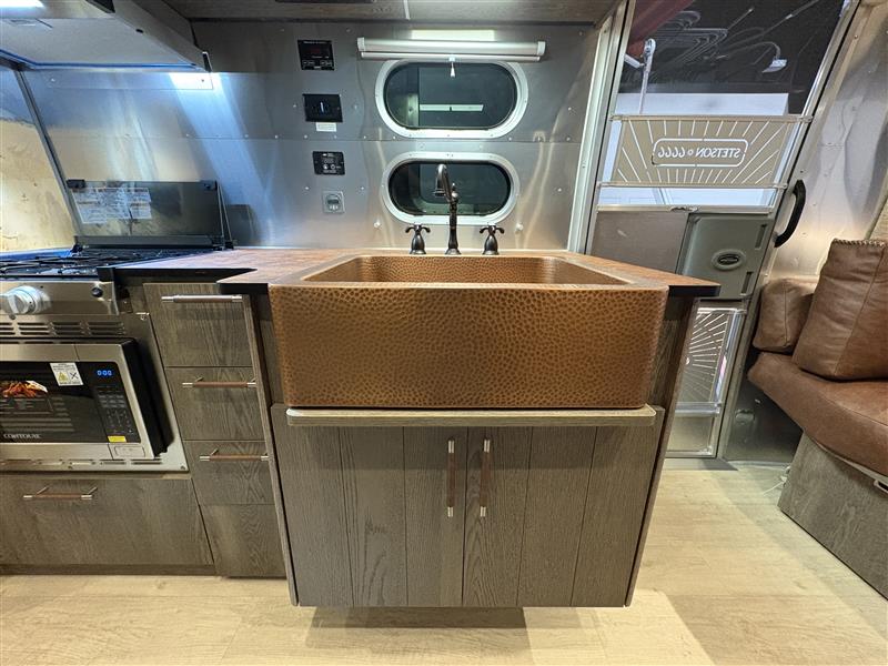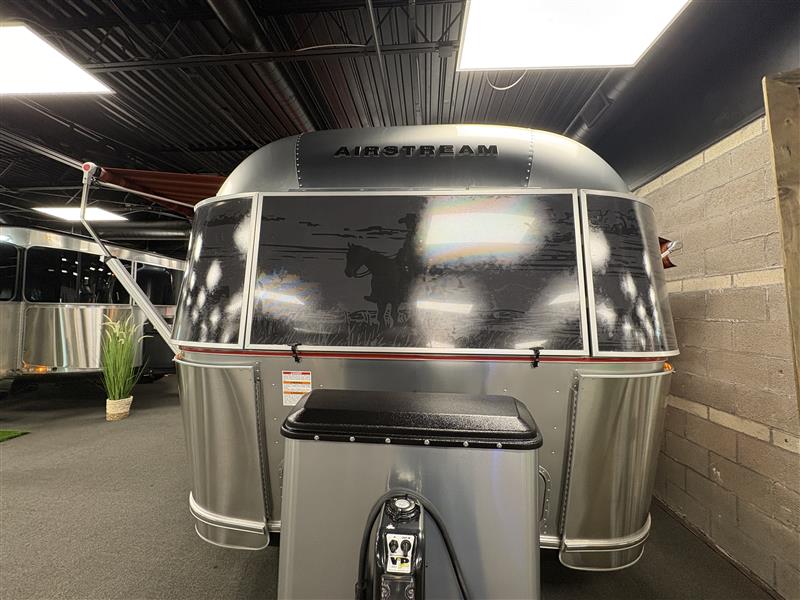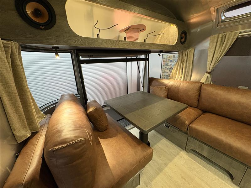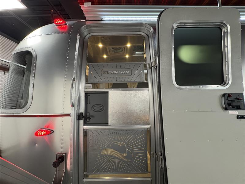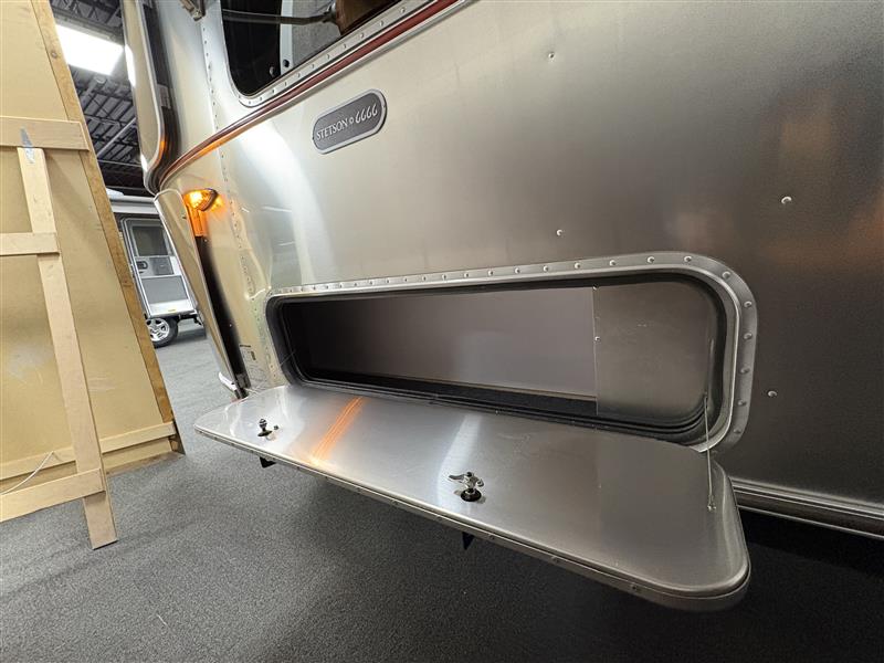 Airstream has collaborated with the hatmakers of Stetson and the Four Sixes Ranch in Texas to bring you the Stetson + 6666 Special Edition travel trailer! You will find Western heritage and modern luxury throughout with genuine leather, convenient hat racks, premium finishes, and handcrafted cabinetry. You will love the rear hatch that opens to give you fresh air and wide-open views of the pasture, and there is a sliding pull-down screen to keep bugs out in the evening. The galley and lounge walls feature custom laminate artwork drawn from Stetson's archive, and the leather cabinet hardware adds subtle Western style you are sure to enjoy. Outside, you'll find a 300-watt solar charging system, a backup camera, insulated and heated tanks, and a SmartPlug 50 Amp power cord to name just a few conveniences!
