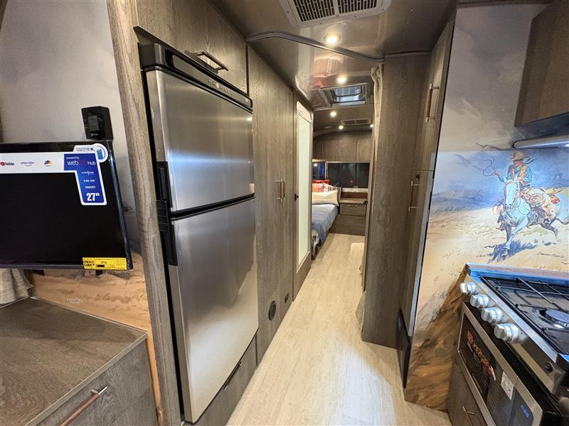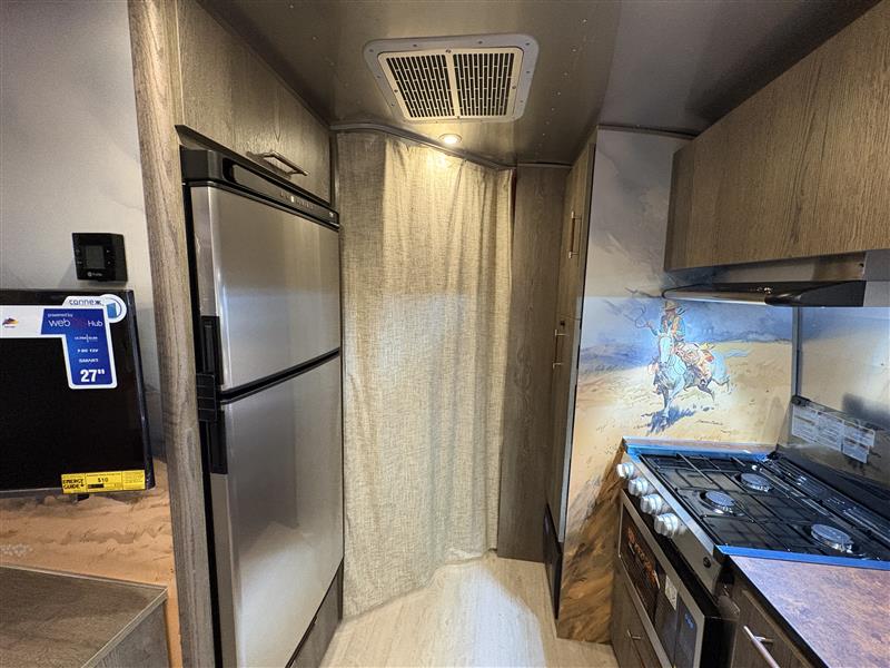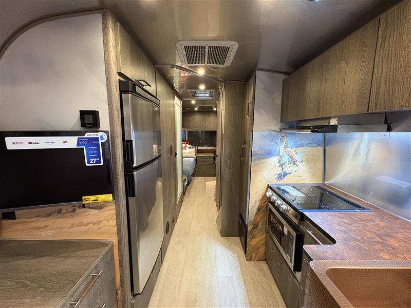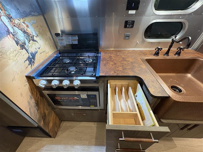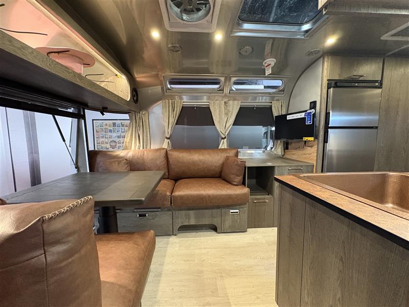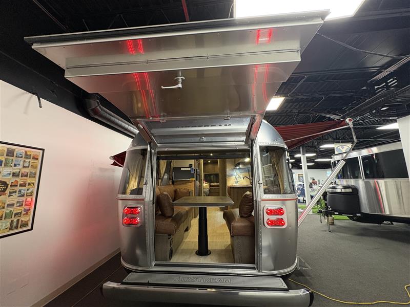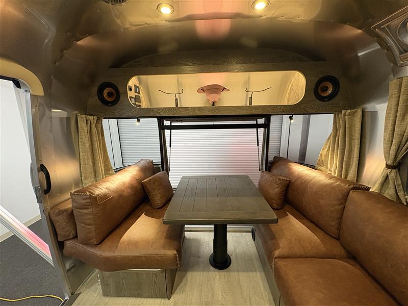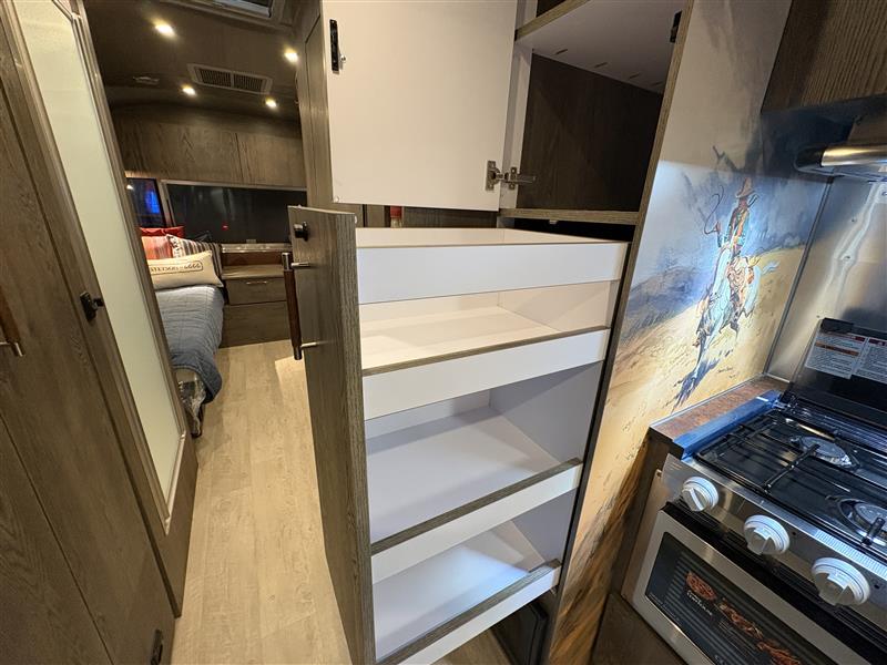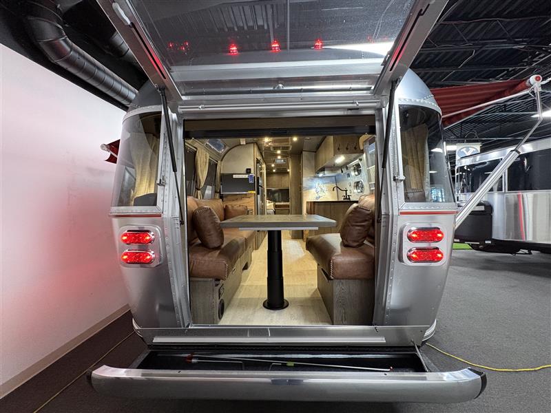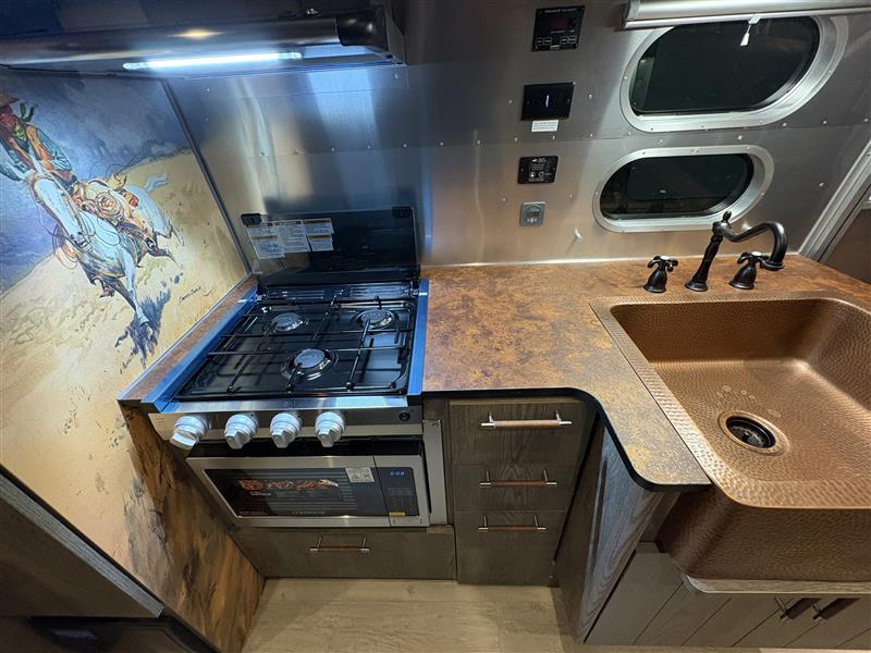 Airstream has collaborated with the hatmakers of Stetson and the Four Sixes Ranch in Texas to bring you the Stetson + 6666 Special Edition travel trailer! You will find Western heritage and modern luxury throughout with genuine leather, convenient hat racks, premium finishes, and handcrafted cabinetry. You will love the rear hatch that opens to give you fresh air and wide-open views of the pasture, and there is a sliding pull-down screen to keep bugs out in the evening. The galley and lounge walls feature custom laminate artwork drawn from Stetson's archive, and the leather cabinet hardware adds subtle Western style you are sure to enjoy. Outside, you'll find a 300-watt solar charging system, a backup camera, insulated and heated tanks, and a SmartPlug 50 Amp power cord to name just a few conveniences!