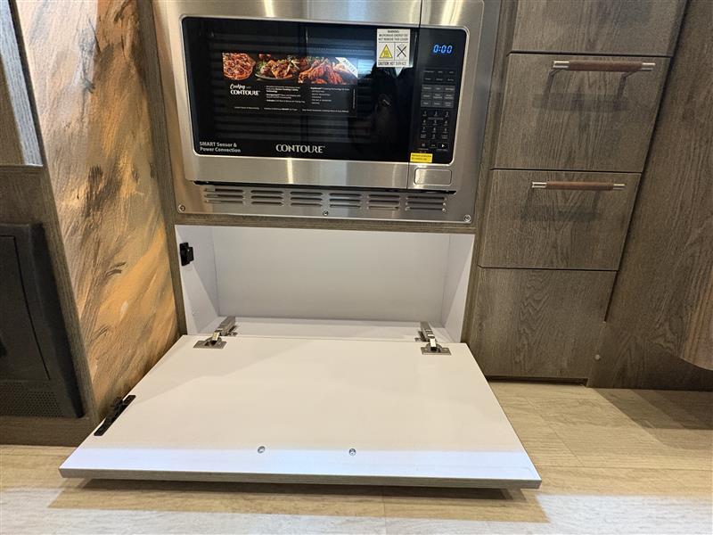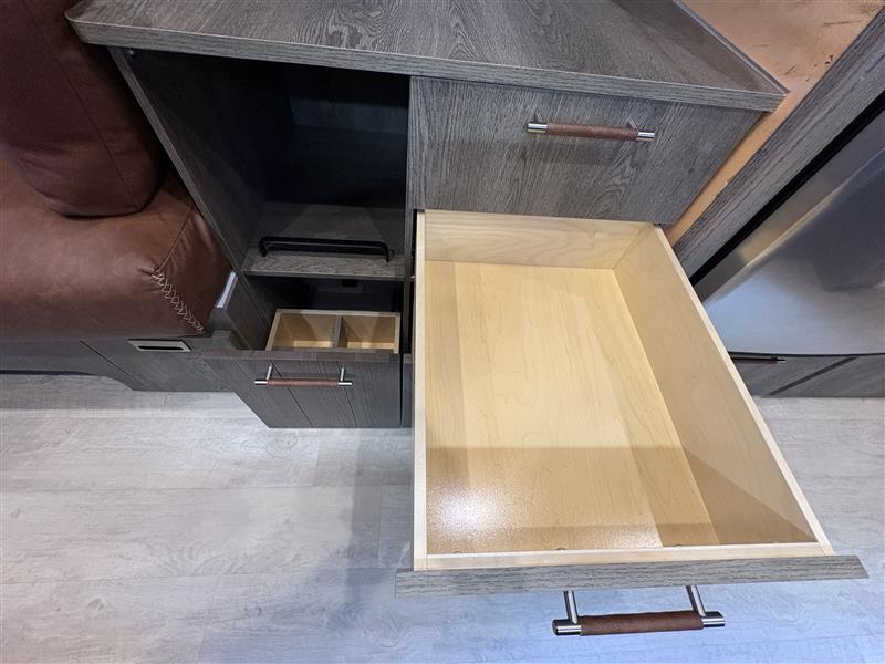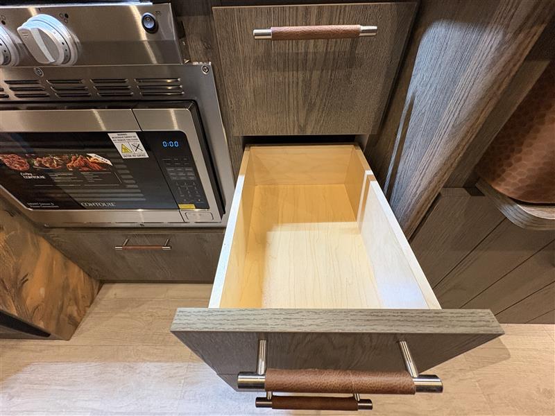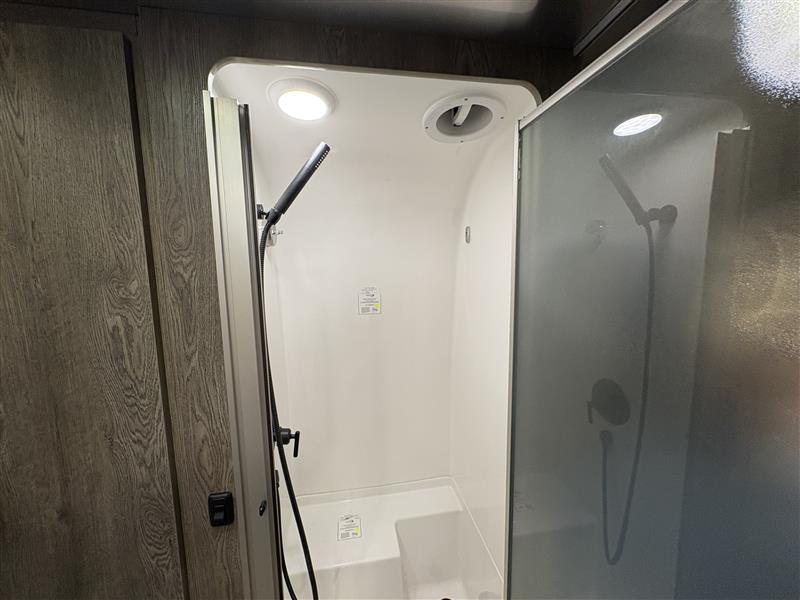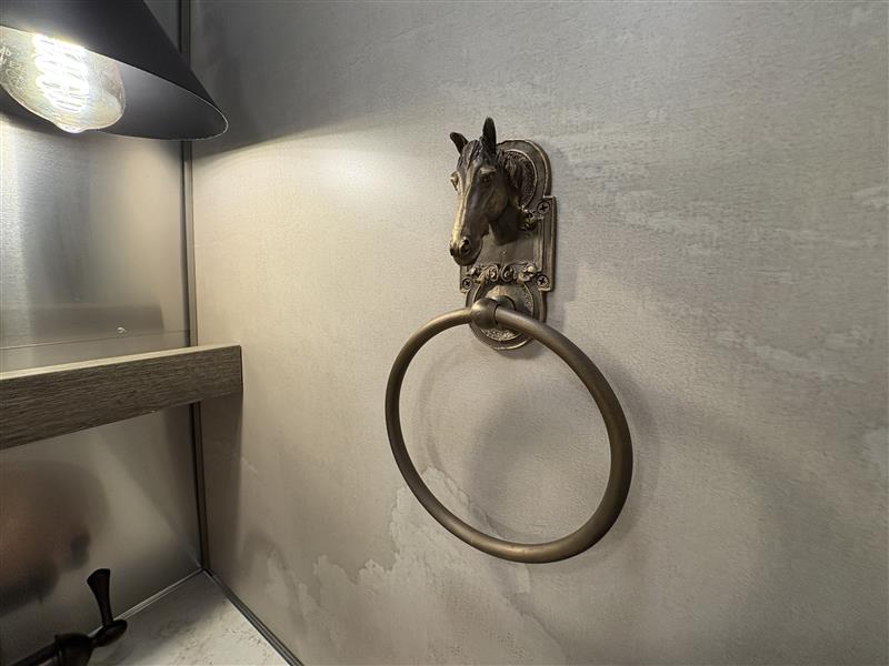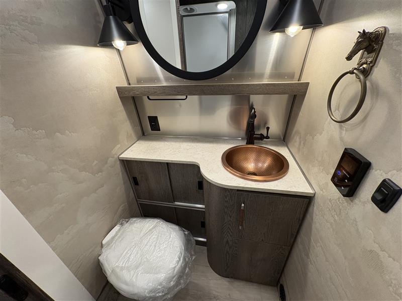 Spend your days outdoors on the ranch and your evenings indoors with all-around comfort in this travel trailer! The front bedroom includes two twin beds with a nightstand in between, along with underbed storage and LED reading lights. The independent shower is right across the hall from the private sink and lavatory, allowing two people to freshen up at once! You can make your best Western meals on the three-burner LP gas stove or choose the optional convection microwave oven which replaces the oven. There is also a farmhouse style hammered copper sink, a 12V refrigerator, an oak dinette table and genuine leather seating, and stylish roller shades.