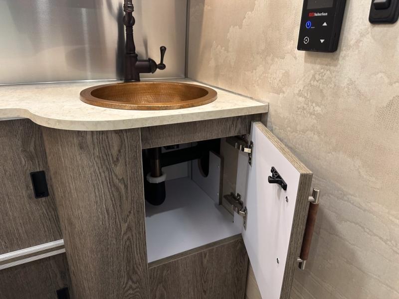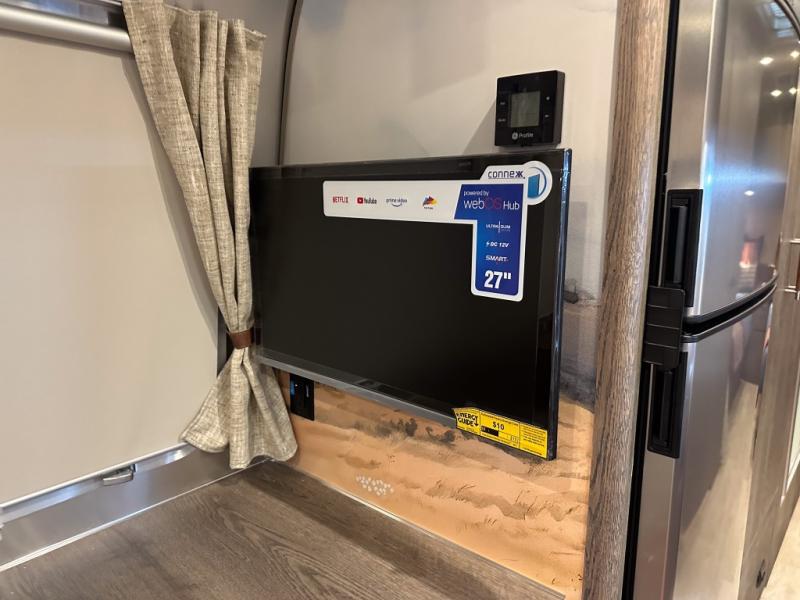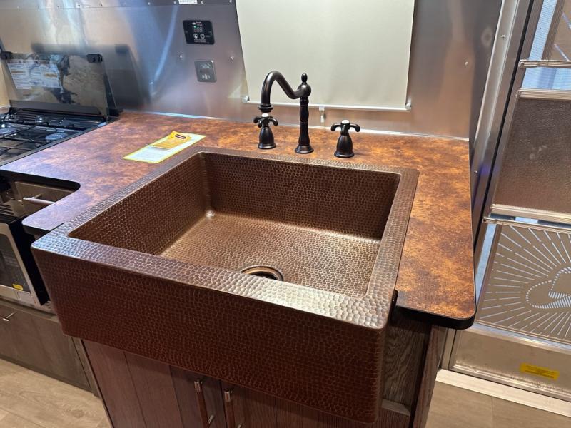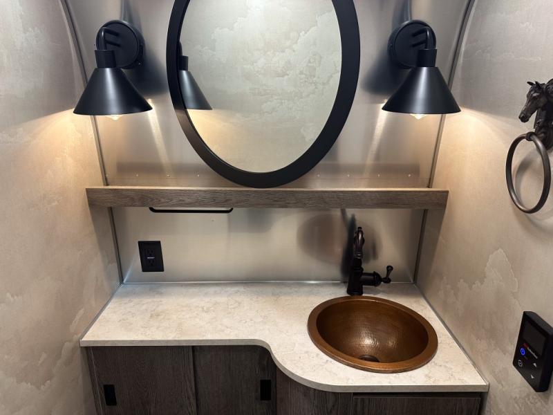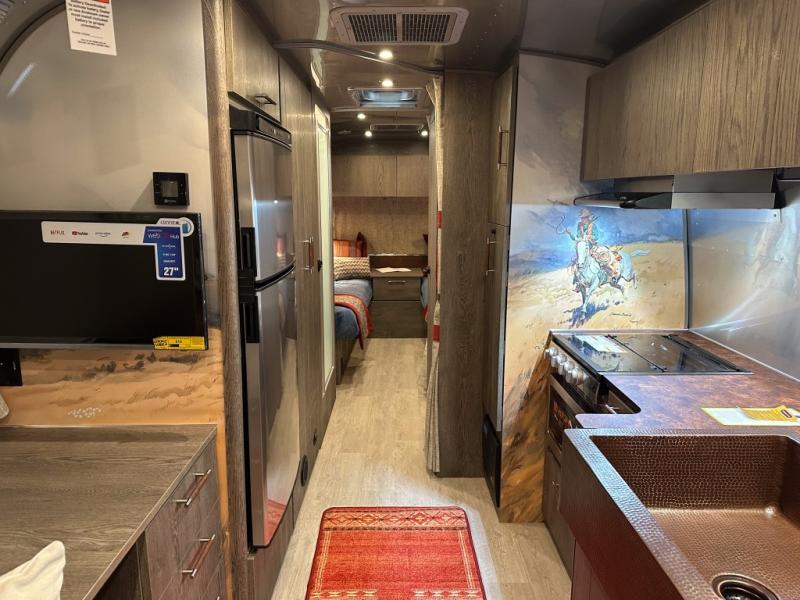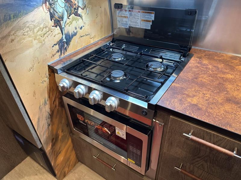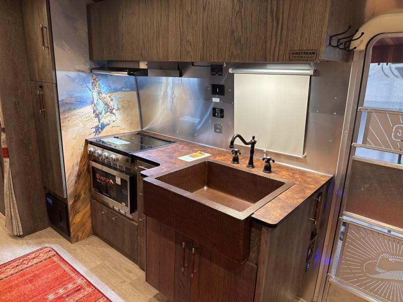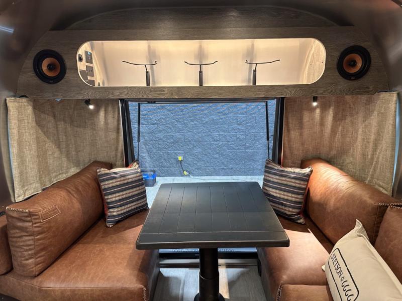 Airstream has collaborated with the hatmakers of Stetson and the Four Sixes Ranch in Texas to bring you the Stetson + 6666 Special Edition travel trailer! You will find Western heritage and modern luxury throughout with genuine leather, convenient hat racks, premium finishes, and handcrafted cabinetry. You will love the rear hatch that opens to give you fresh air and wide-open views of the pasture, and there is a sliding pull-down screen to keep bugs out in the evening. The galley and lounge walls feature custom laminate artwork drawn from Stetson's archive, and the leather cabinet hardware adds subtle Western style you are sure to enjoy. Outside, you'll find a 300-watt solar charging system, a backup camera, insulated and heated tanks, and a SmartPlug 50 Amp power cord to name just a few conveniences!