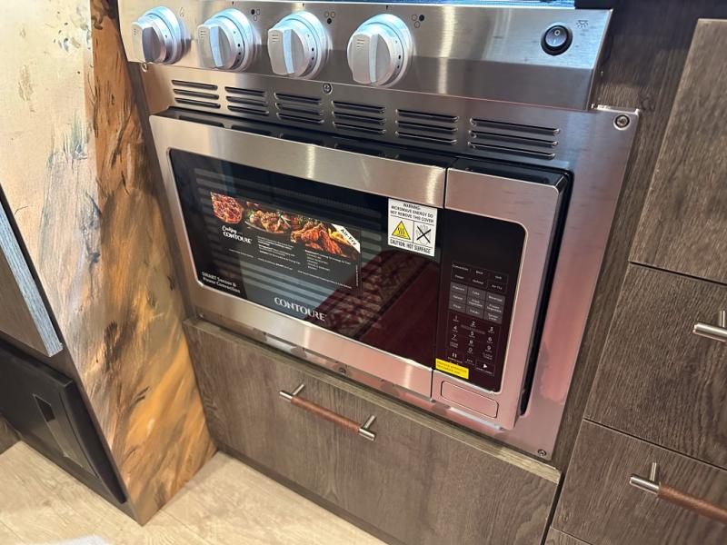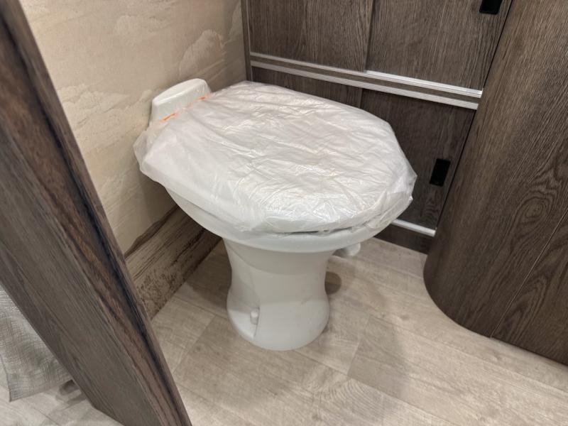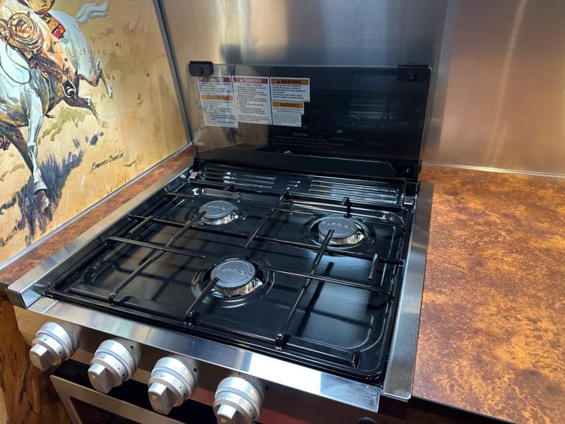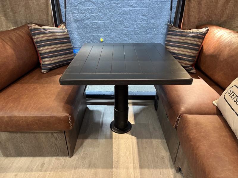 Spend your days outdoors on the ranch and your evenings indoors with all-around comfort in this travel trailer! The front bedroom includes two twin beds with a nightstand in between, along with underbed storage and LED reading lights. The independent shower is right across the hall from the private sink and lavatory, allowing two people to freshen up at once! You can make your best Western meals on the three-burner LP gas stove or choose the optional convection microwave oven which replaces the oven. There is also a farmhouse style hammered copper sink, a 12V refrigerator, an oak dinette table and genuine leather seating, and stylish roller shades.