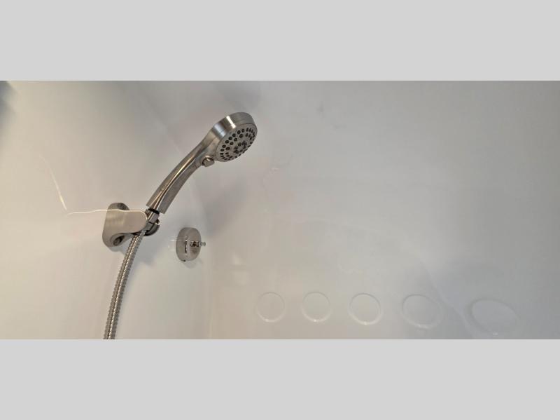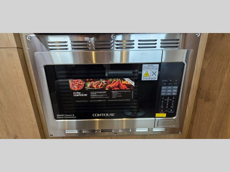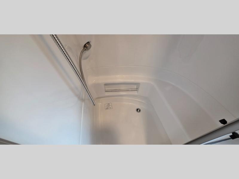 This travel trailer has a layout that feels spacious while still offering privacy! The front bedroom has twin beds, a panoramic front window, a nightstand, and even a Smart TV. The rear full bath has every amenity you need, including a reeded glass shower door, removable hand held shower head, and a retractable clothes line so you can hang your laundry or bathing suits. At the center of the action are the living room and kitchen, with a U-dinette for comfortable seating. Convert the dinette to additional sleeping space at night if you need. Cook up your meals with the high-end appliances, including a 12V refrigerator, three burner stove, and oven, or you can choose the optional convection microwave.