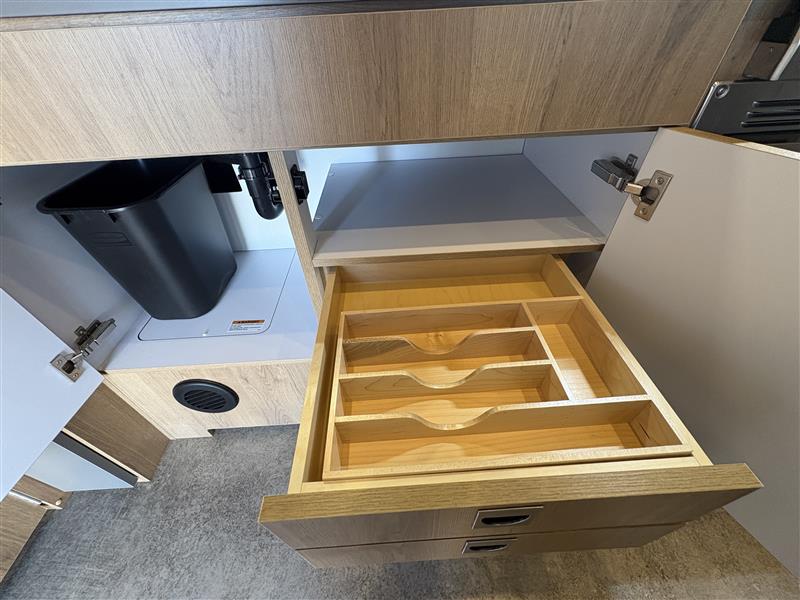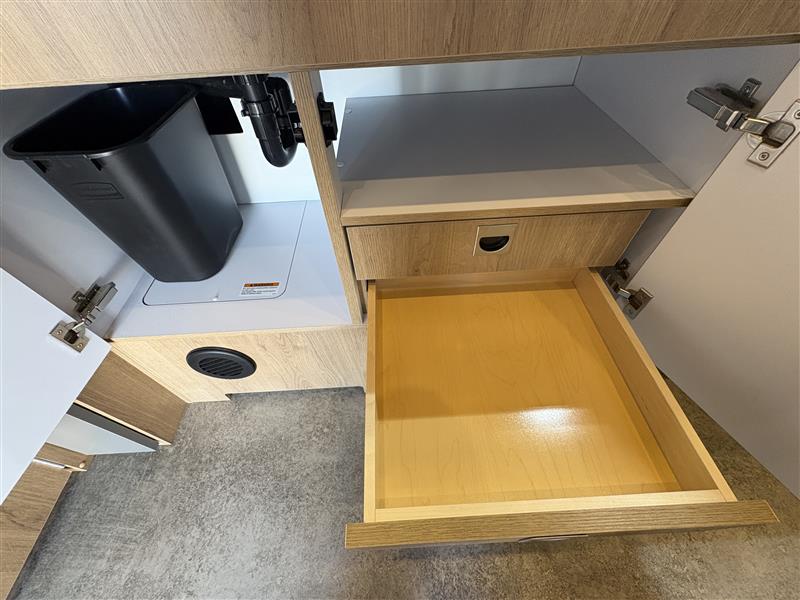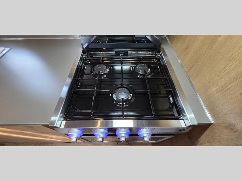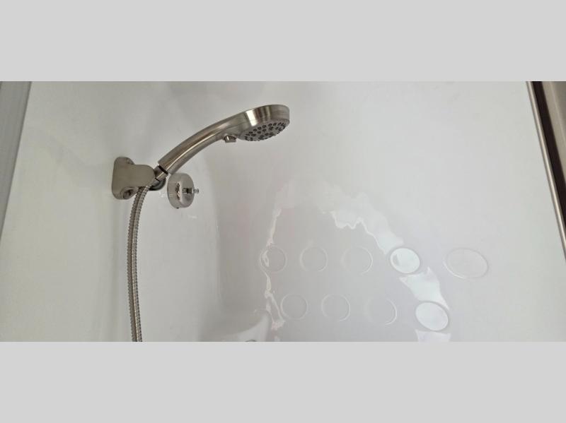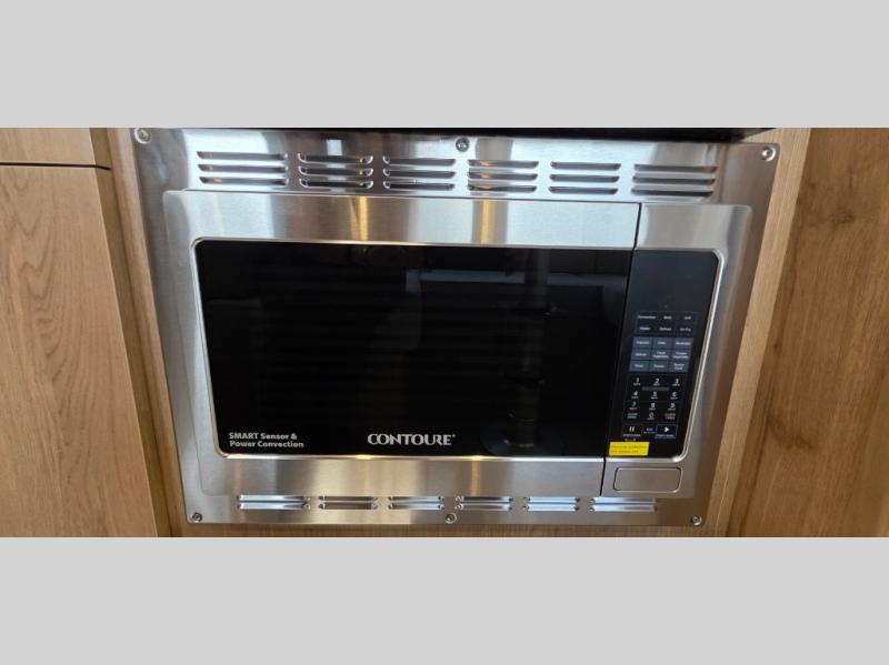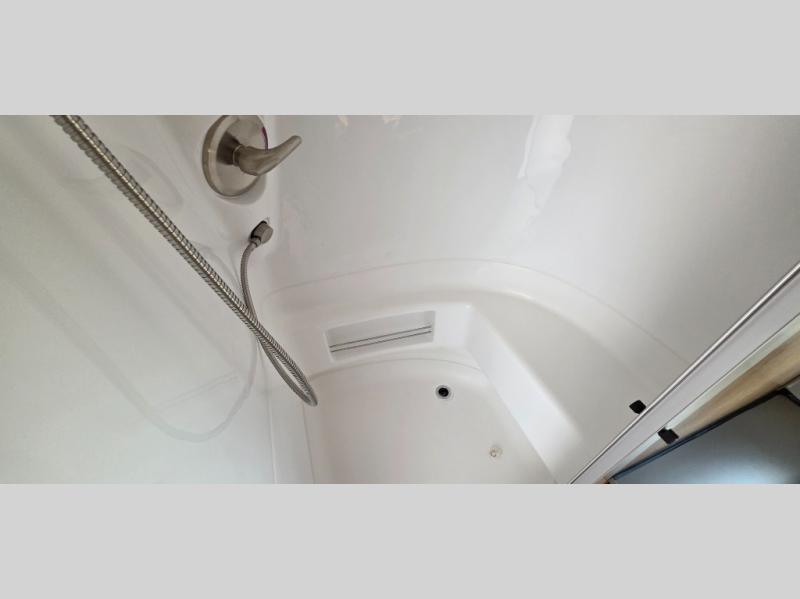 This travel trailer has a layout that feels spacious while still offering privacy! The front bedroom has twin beds, a panoramic front window, a nightstand, and even a Smart TV. The rear full bath has every amenity you need, including a reeded glass shower door, removable hand held shower head, and a retractable clothes line so you can hang your laundry or bathing suits. At the center of the action are the living room and kitchen, with a U-dinette for comfortable seating. Convert the dinette to additional sleeping space at night if you need. Cook up your meals with the high-end appliances, including a 12V refrigerator, three burner stove, and oven, or you can choose the optional convection microwave.