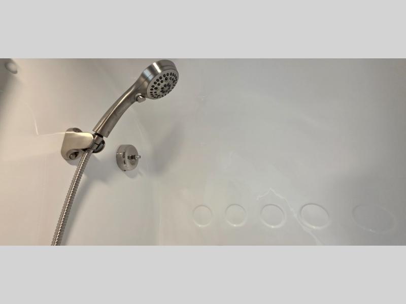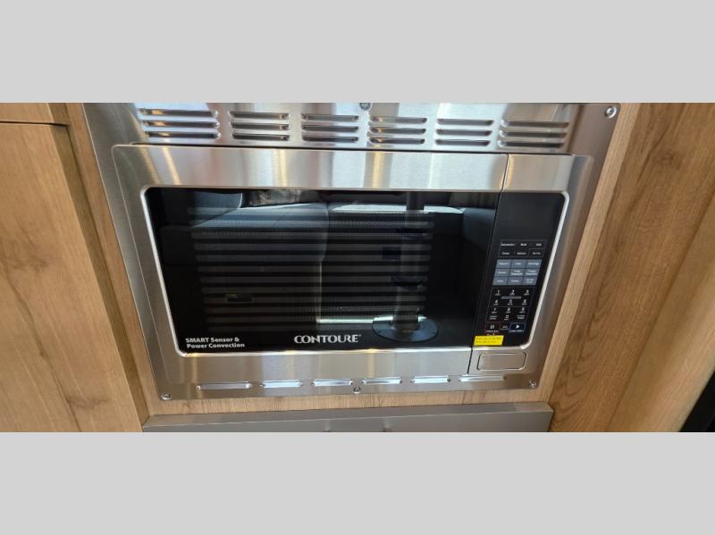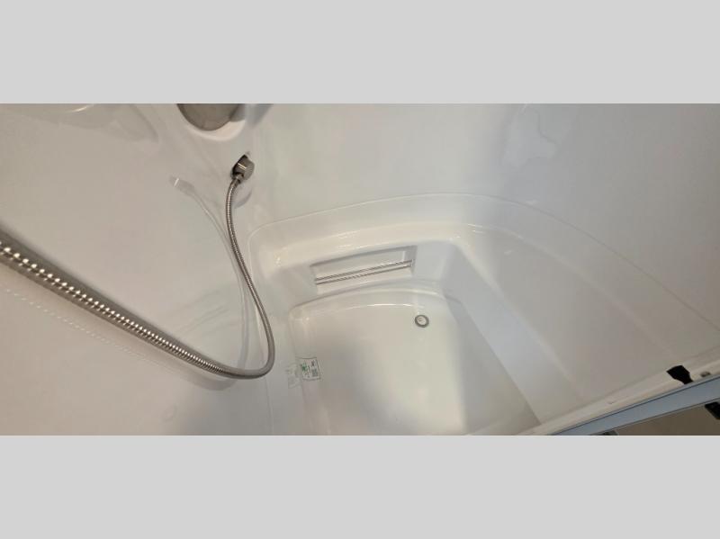 This travel trailer has a layout that feels spacious while still offering privacy! The front bedroom has twin beds, a panoramic front window, a nightstand, and even a Smart TV. The rear full bath has every amenity you need, including a reeded glass shower door, removable handheld shower head, and a retractable clothesline so you can hang your laundry or bathing suits. At the center of the action are the living room and kitchen, with a U-dinette for comfortable seating. Convert the dinette to additional sleeping space at night if you need. Cook up your meals with the high-end appliances, including a 12V refrigerator, three burner stove, and oven, or you can choose the optional convection microwave.