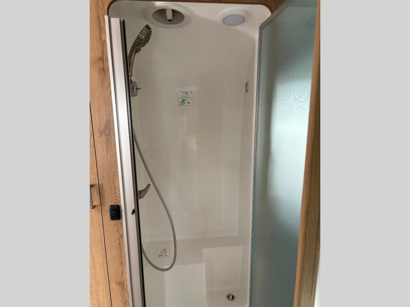 Trade your briefcase for luggage and head for the hills in this travel trailer for five! When you arrive at your destination, you can set up the ZipDee manual patio awning with LED lights, grab the camp chairs from the storage, and relax with a cold drink. There is a private toilet and vanity in a half bath, with the independent shower across the hall so two people can freshen up at once. You'll find plenty of storage throughout this model, including a closet to keep clothes wrinkle-free, underbed storage, plus upper and lower cabinets. The kitchen includes high-end appliances, including a 12V refrigerator, and a three burner stove and oven, or you can choose the optional convection microwave. Your crew can gather at the L-shaped dinette with panoramic views provided by the windows, and your guests can sleep here at night. The optional rear hatch can be added for even more convenience, as well as optional twin beds in place of the queen bed if you choose.