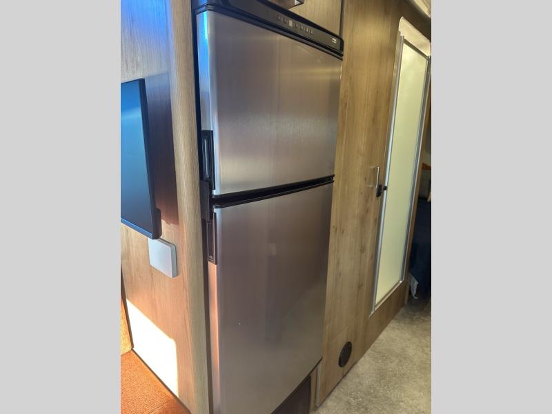 Trade your briefcase for luggage and head for the hills in this travel trailer for five! When you arrive at your destination, you can set up the ZipDee manual patio awning with LED lights, grab the camp chairs from the storage, and relax with a cold drink. There is a private toilet and vanity in a half bath, with the independent shower across the hall so two people can freshen up at once. You'll find plenty of storage throughout this model, including a closet to keep clothes wrinkle-free, underbed storage, plus upper and lower cabinets. The kitchen includes high-end appliances, including a 12V refrigerator, and a three-burner stove and oven, or you can choose the optional convection microwave. Your crew can gather at the L-shaped dinette with panoramic views provided by the windows, and your guests can sleep here at night, while you take the front twin beds.