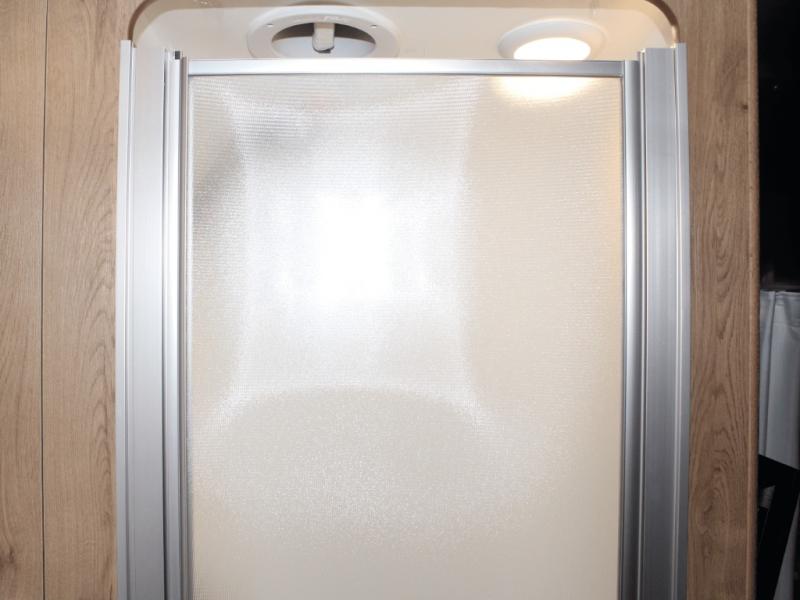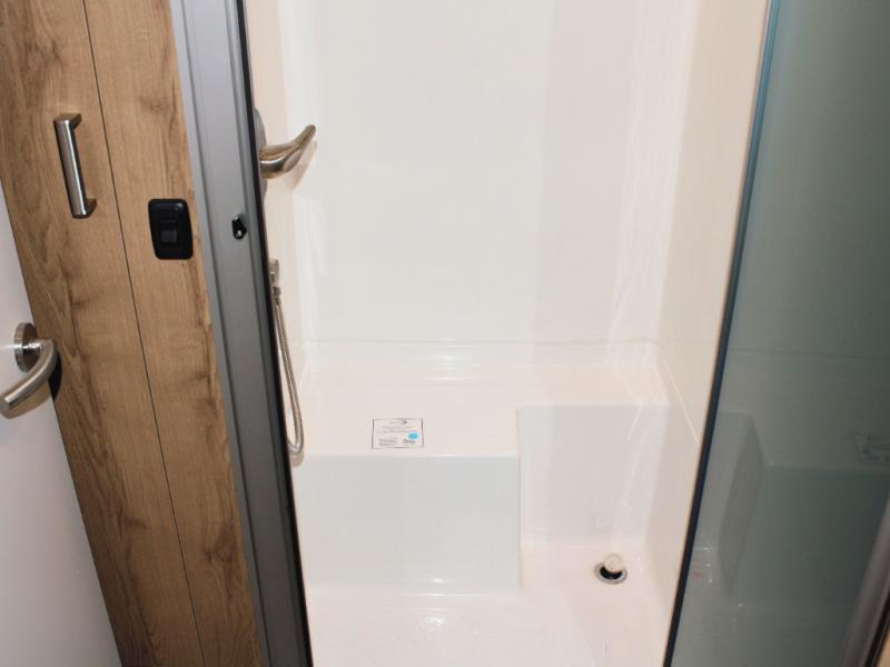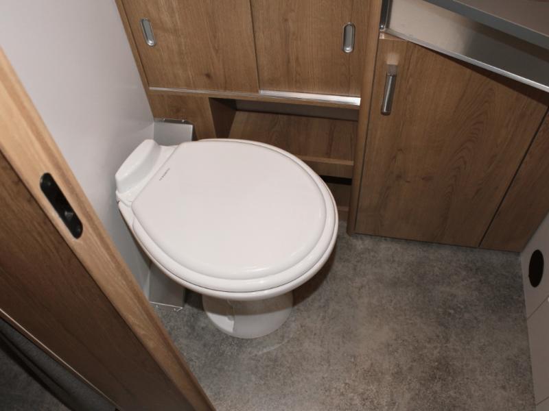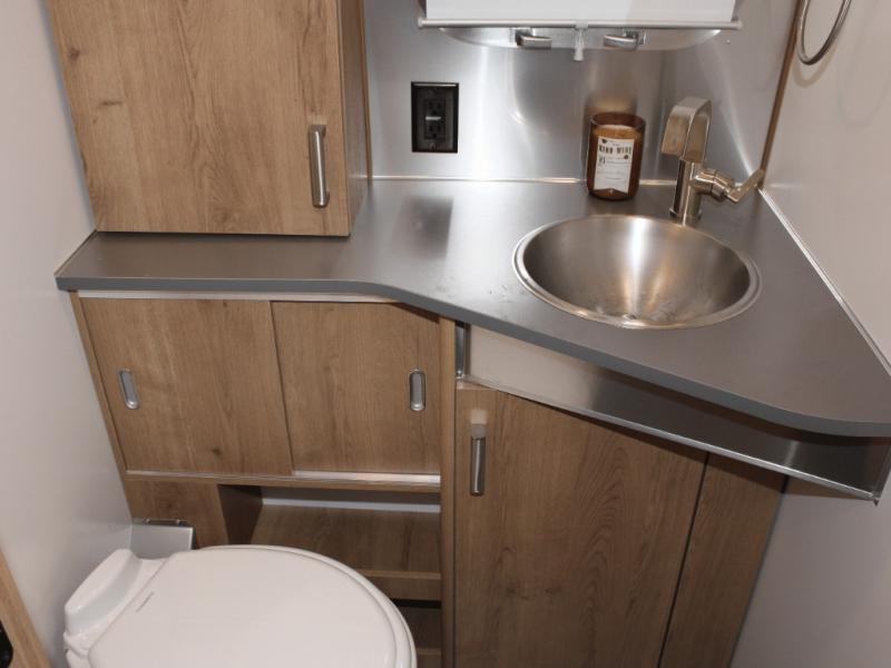 When you arrive, setup is effortless. Roll out the ZipDee manual patio awning with LED lighting, pull your camp chairs from exterior storage, and unwind with panoramic views all around. Inside, the intelligently designed layout allows multiple people to move comfortably, thanks to the split bath configuration featuring a private half bath with toilet and vanity and a separate shower across the hall, so two people can freshen up at the same time.