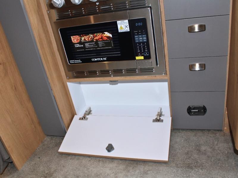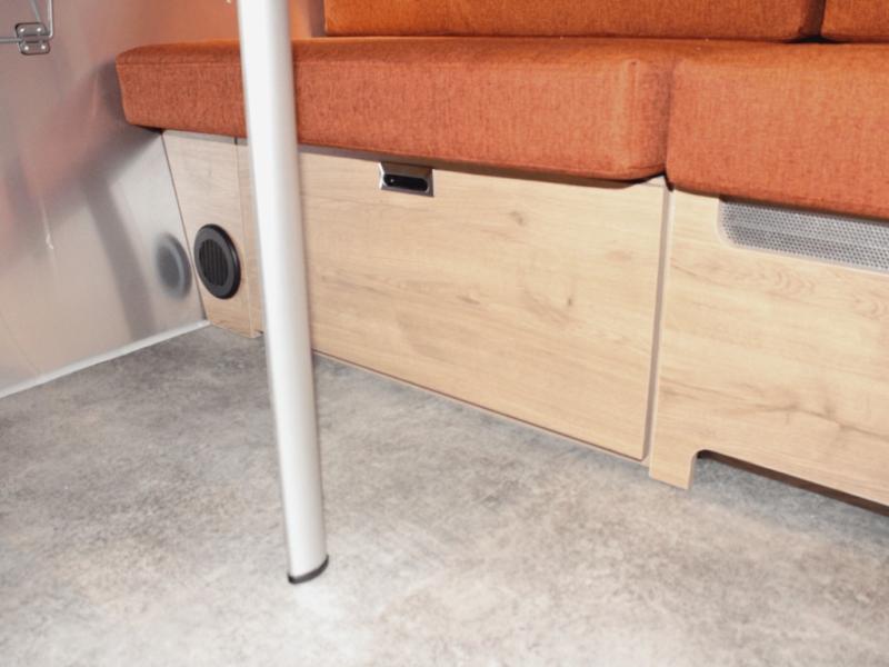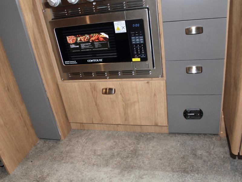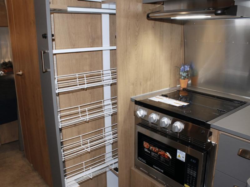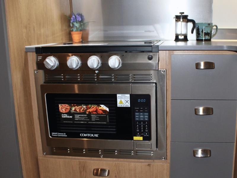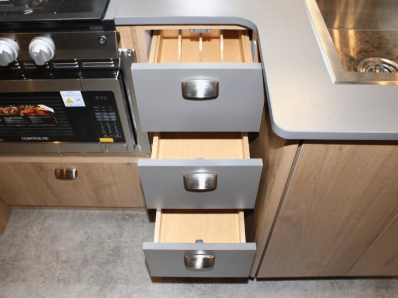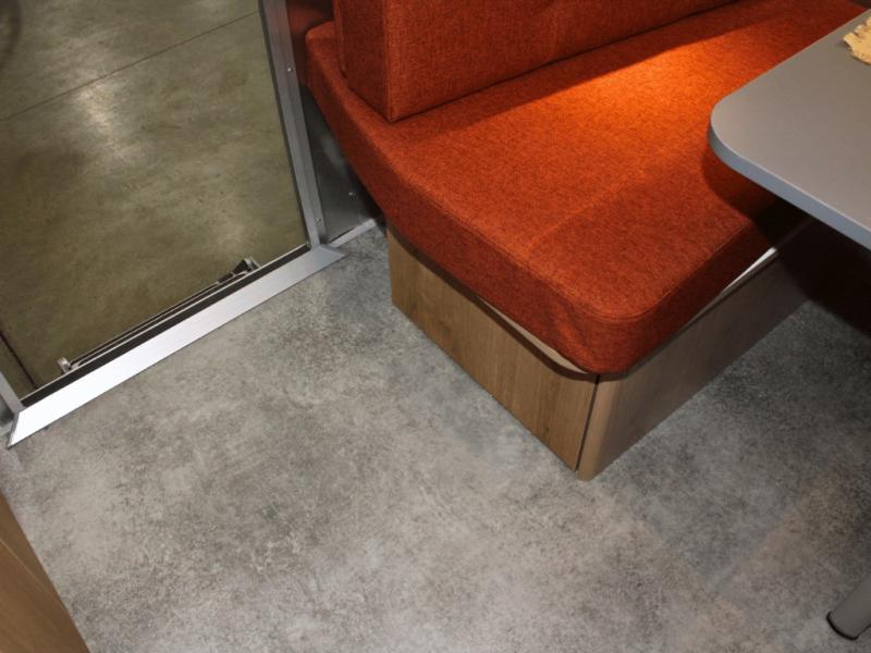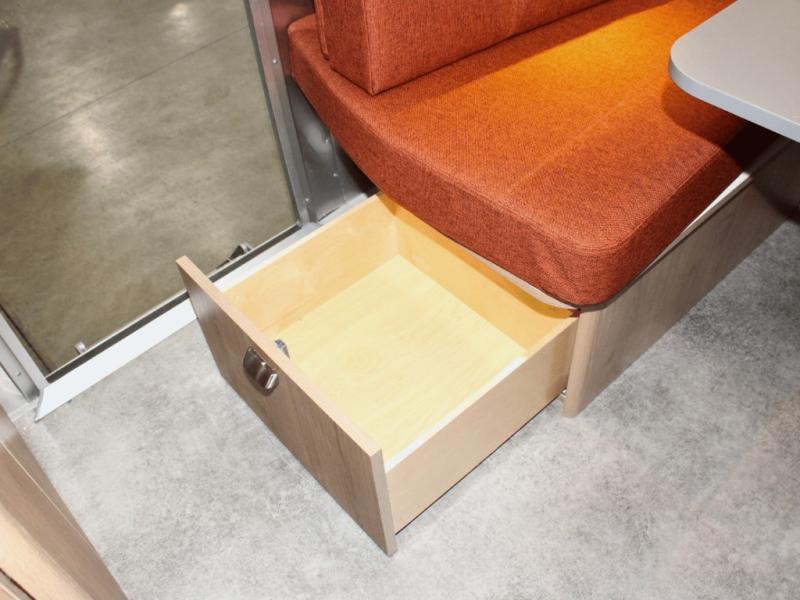 The kitchen is ready for anything from quick snacks to full meals, featuring high-end appliances, a three-burner stove with oven, a 12V refrigerator, and the option to upgrade to a convection microwave. Mealtime and game night are a breeze at the L-shaped dinette, surrounded by panoramic windows that bring the outdoors in. At night, this space easily converts to additional sleeping for guests.