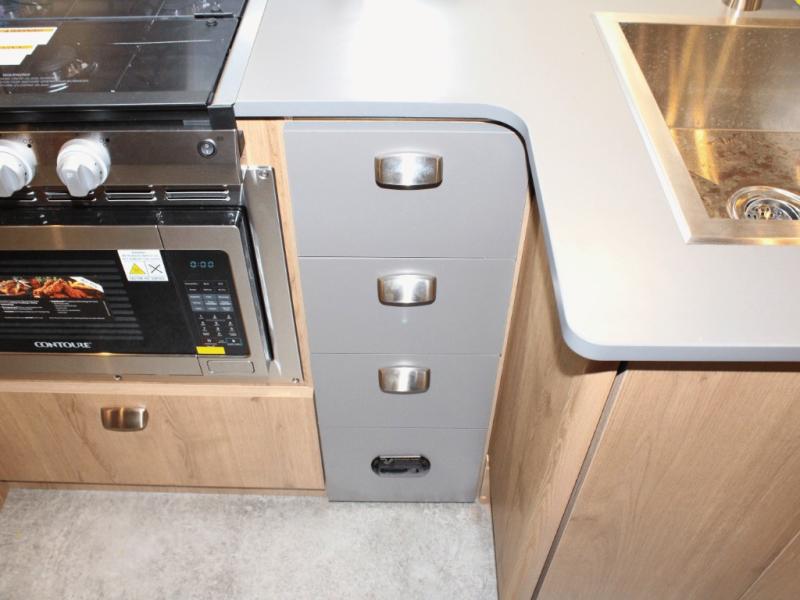 What truly sets the Trade Wind apart is its unmatched power system. As Airstream’s most capable travel trailer, it comes equipped with a solar charging system with interior monitoring, heated lithium batteries with remote monitoring, and a massive internal battery bank designed to keep you going far beyond the campground. Rugged travel is made easier with a 3-inch suspension lift, Goodyear Wrangler Workhorse tires, and a rear-view monitoring system for confident towing and parking.