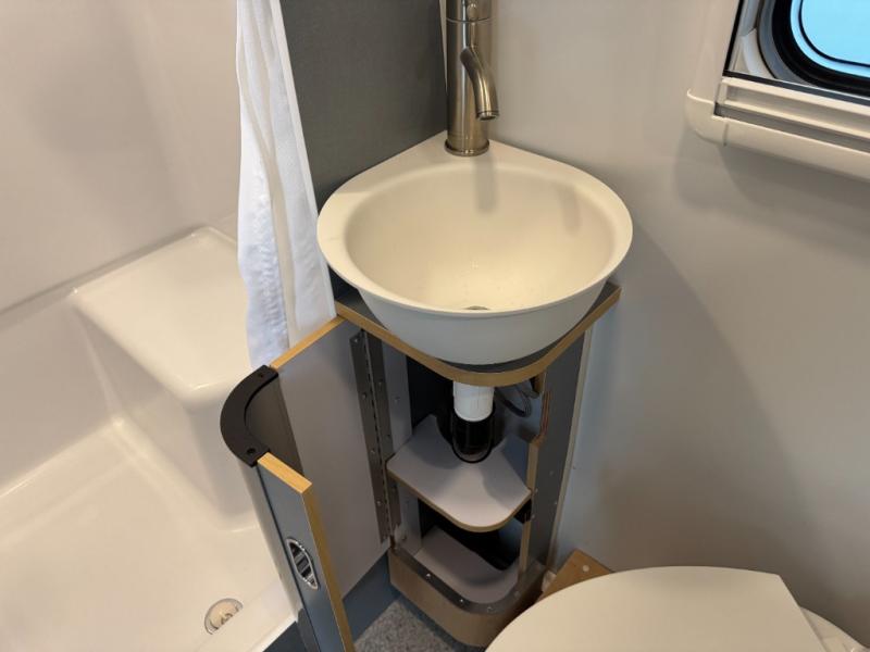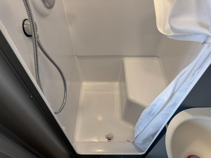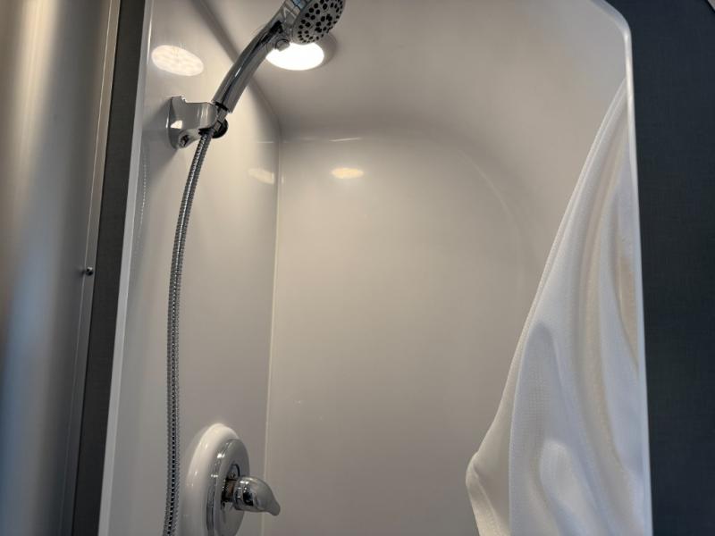 Adventure awaits in this travel trailer for four campers! Once you arrive at your destination, you can make a quick lunch in the kitchen, then dine at the convertible dinette. The middle bath includes everything you need to freshen up each day, and the wardrobe between the bath and rear bed will help you keep your things tidy. A V-nose bed includes a memory foam mattress for added comfort, plus there is storage under the bed and two wall-mounted nightstands with USB ports to keep your phone charged.
