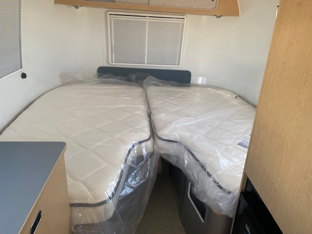 Adventure awaits in this travel trailer for four campers! Once you arrive at your destination, you can make a quick lunch in the kitchen, then dine at the convertible dinette. The middle bath includes everything you need to freshen up each day, and the wardrobe between the bath and rear beds will help you keep your things tidy. The V-nose twin beds include a memory foam mattress for added comfort, plus there is storage under the bed to store your bags away.