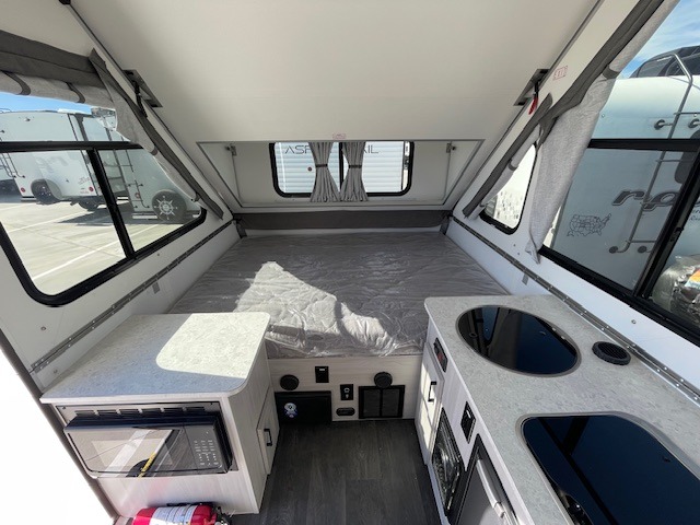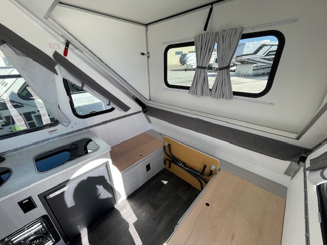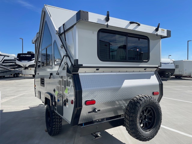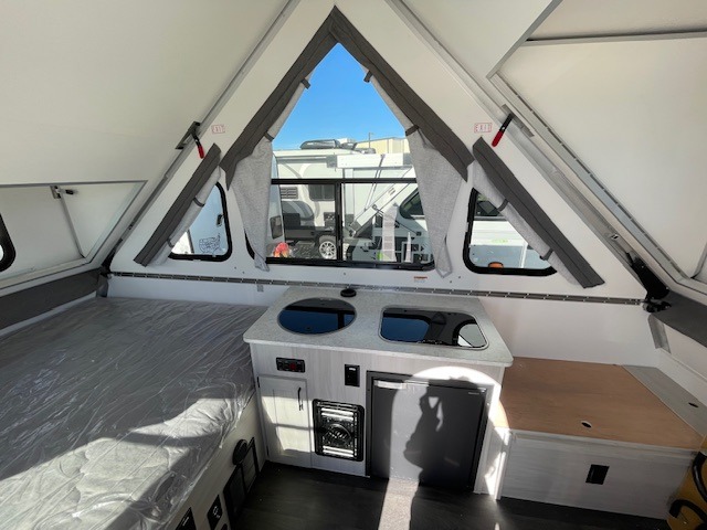 Pack your bags and be on the road in no-time with this lightweight A-frame camper that can sleep three people. You'll enjoy having a front booth dinette and a rear bed/mattress for comfortable dining and sleeping space. Whip up a hearty lunch on the two-burner stove or use the convenient microwave oven. There is also a 3.2 cu. ft. 12V refrigerator for perishables and additional storage space for dry goods, and an optional front and/or rear hard dormer can be added if you want additional standing space!