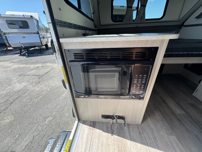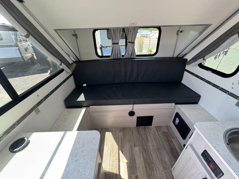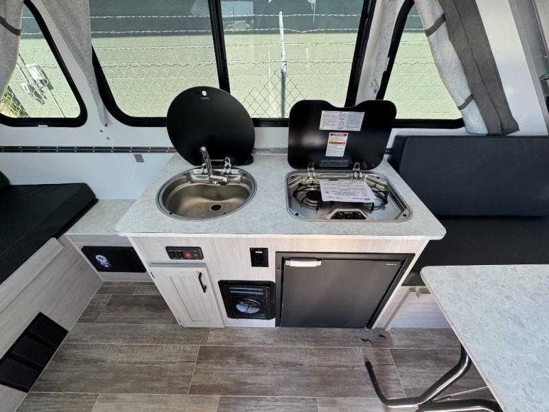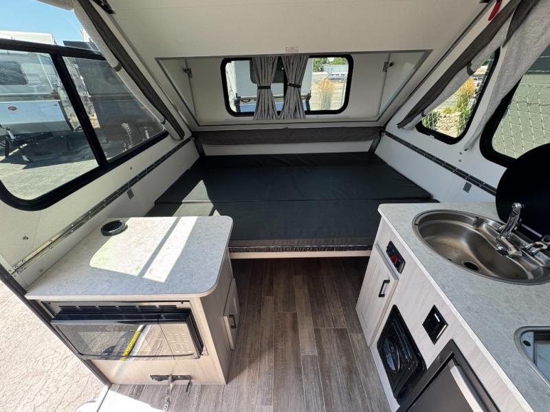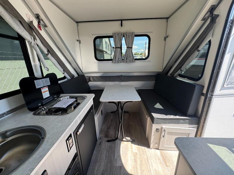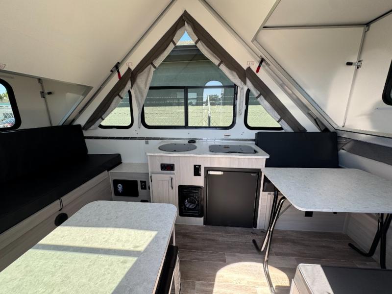 Camping has never been easier than in this A-frame camper. Once you arrive at your destination, grab your gear from the two exterior baggage doors, then head inside to make lunch on the two-burner stove top. The sofa bed can convert to a 60" x 76" bed, and the dinette converts to a 46" x 76" bed for comfortable sleeping space at night. You will also enjoy LED interior lights and electrical outlets to keep you charged up, and there is plenty of storage for your camp gear. And an optional front and/or rear hard dormer can be added if you want additional standing space!