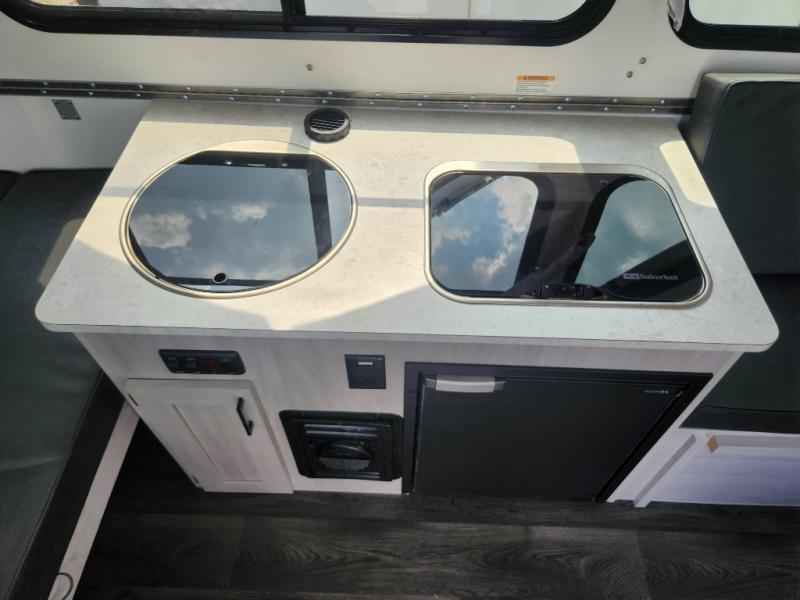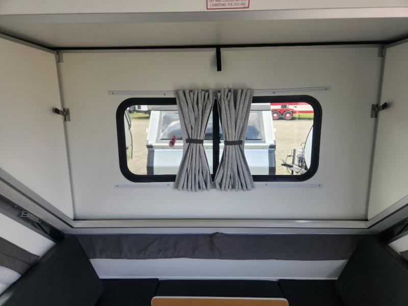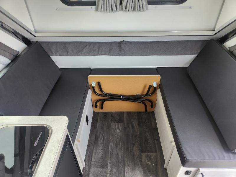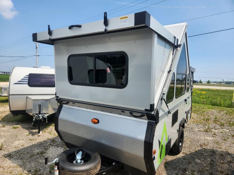 Camping has never been easier than in this A-frame camper. Once you arrive at your destination, grab your gear from the two exterior baggage doors, then head inside to make lunch on the two burner stove top. The sofa bed can convert to a 60" x 76" bed, and the dinette converts to a 46" x 76" bed for comfortable sleeping space at night. You will also enjoy LED interior lights and electrical outlets to keep you charged up, and there is plenty of storage for your camp gear.
