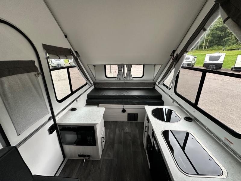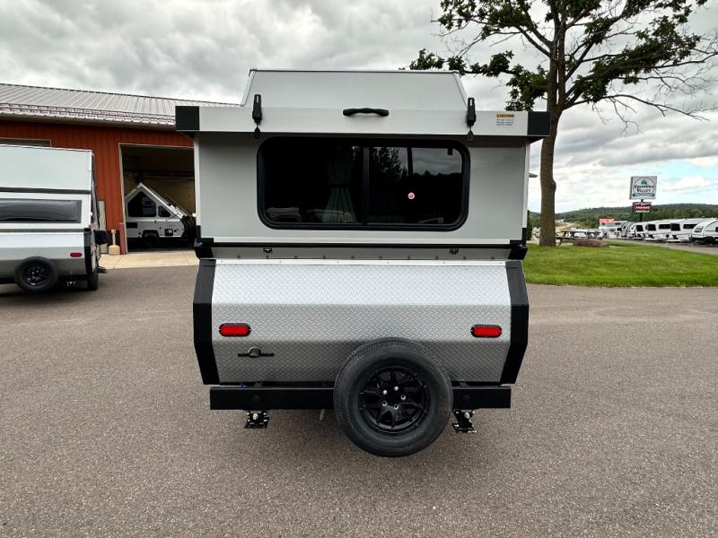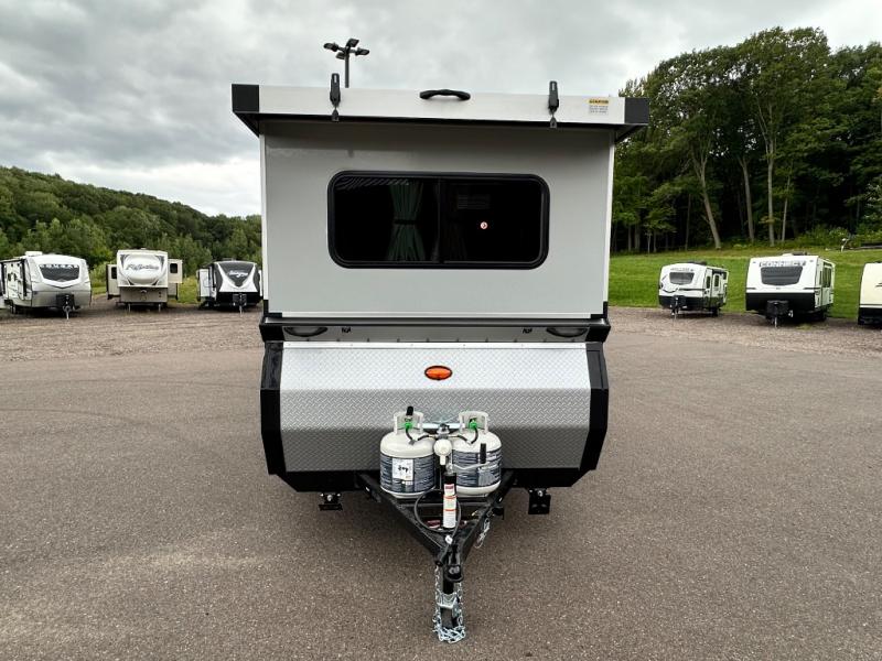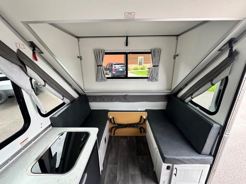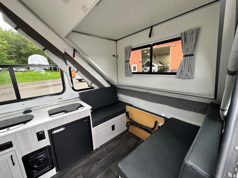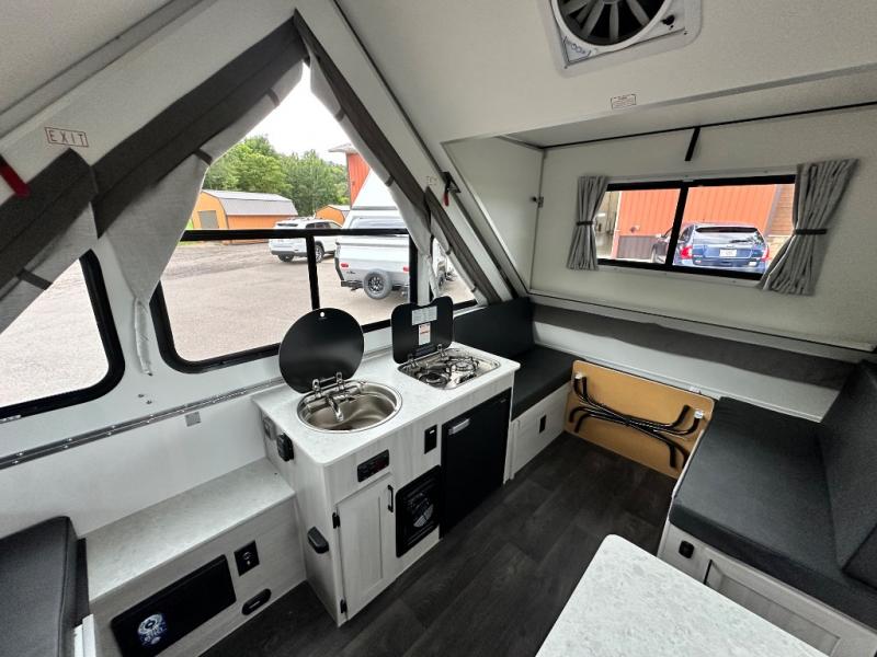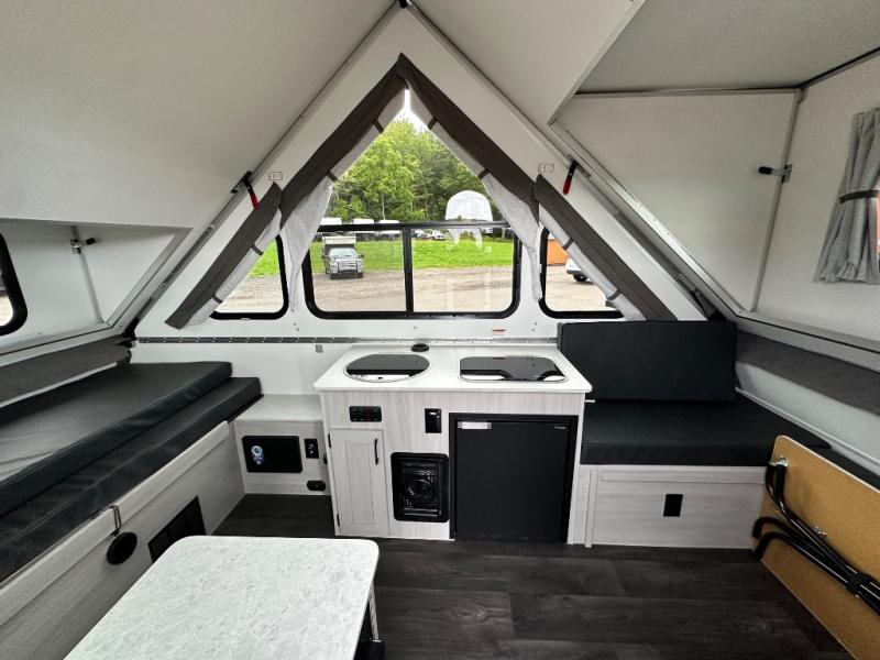 Camping has never been easier than in this A-frame camper. Once you arrive at your destination, grab your gear from the two exterior baggage doors, then head inside to make lunch on the two-burner stove top. The sofa bed can convert to a 60" x 76" bed, and the dinette converts to a 46" x 76" bed for comfortable sleeping space at night. You will also enjoy LED interior lights and electrical outlets to keep you charged up, and there is plenty of storage for your camp gear. And an optional front and/or rear hard dormer can be added if you want additional standing space!