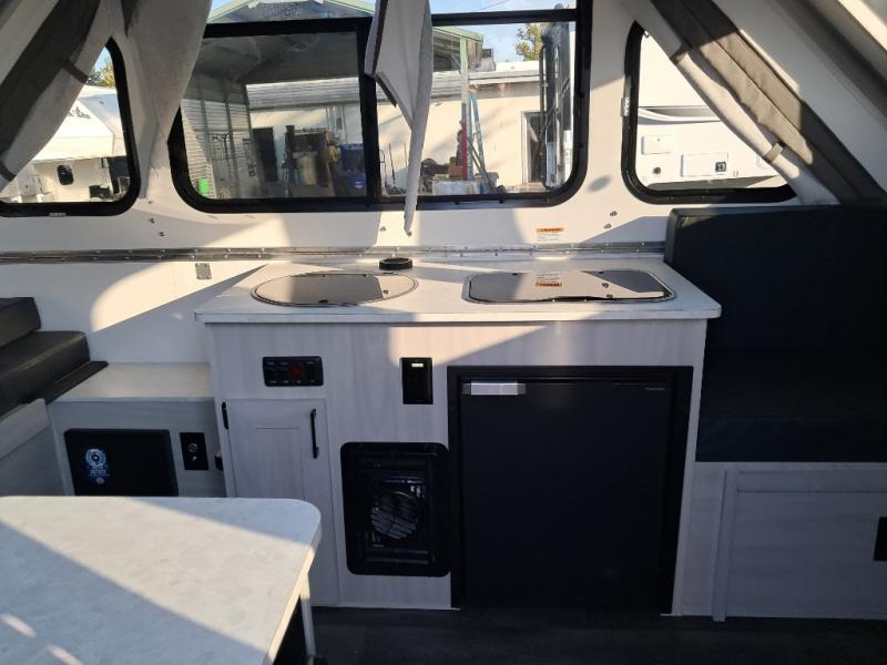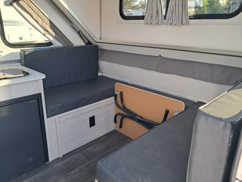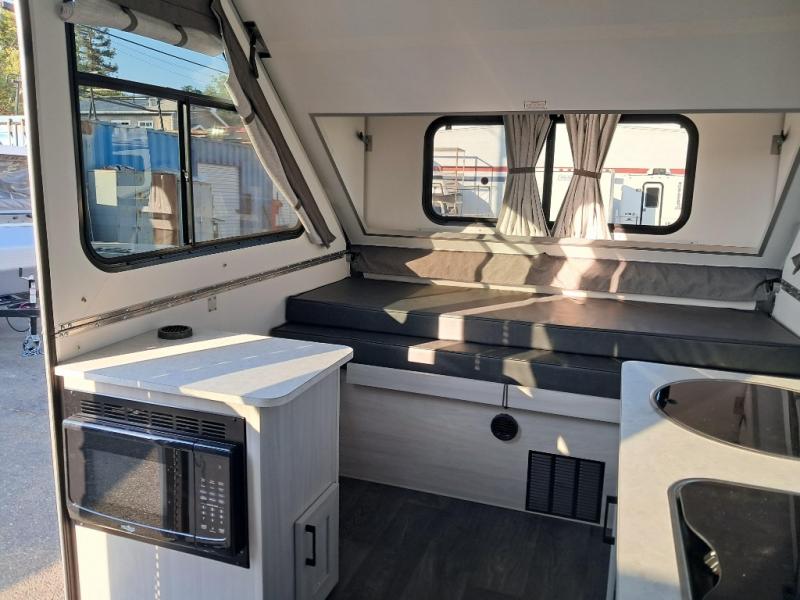 Camping has never been easier than in this A-frame camper. Once you arrive at your destination, grab your gear from the two exterior baggage doors, then head inside to make lunch on the two burner stove top. The sofa bed can convert to a 60" x 76" bed, and the dinette converts to a 46" x 76" bed for comfortable sleeping space at night. You will also enjoy LED interior lights and electrical outlets to keep you charged up, and there is plenty of storage for your camp gear.
