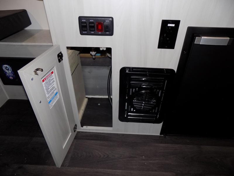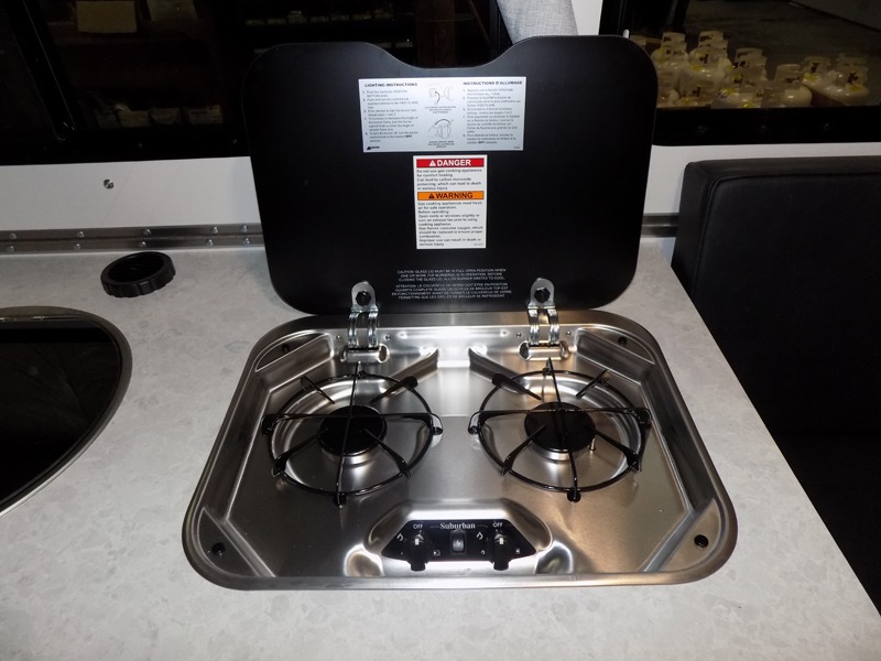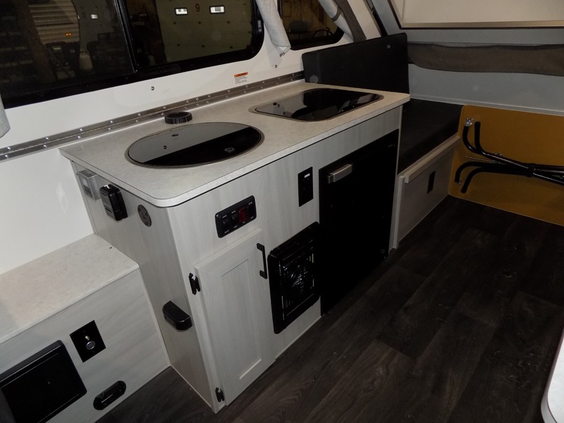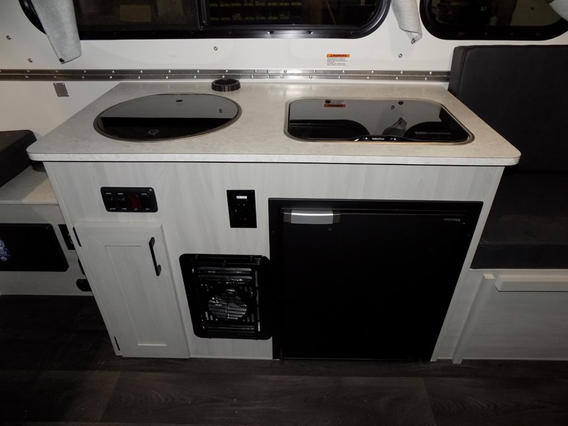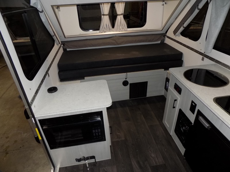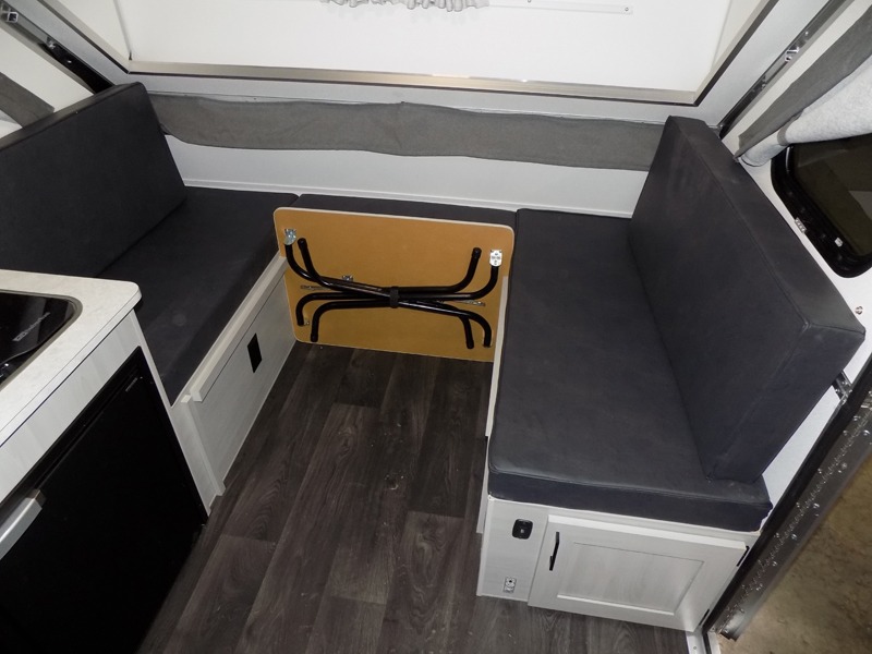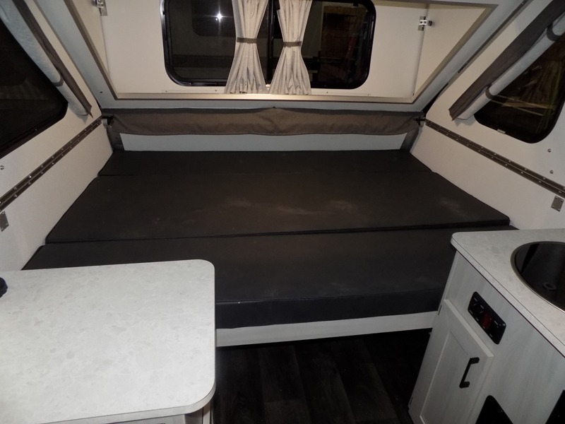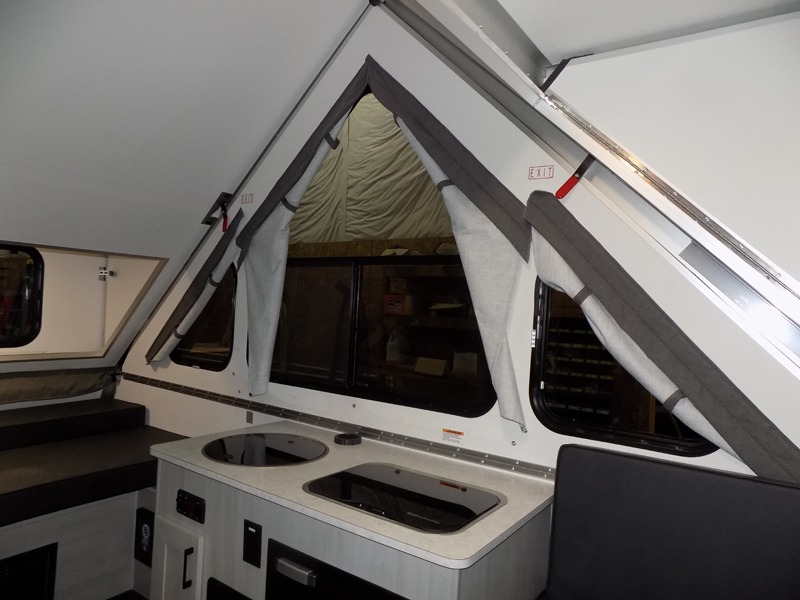 Camping has never been easier than in this A-frame camper. Once you arrive at your destination, grab your gear from the two exterior baggage doors, then head inside to make lunch on the two-burner stove top. The sofa bed can convert to a 60" x 76" bed, and the dinette converts to a 46" x 76" bed for comfortable sleeping space at night. You will also enjoy LED interior lights and electrical outlets to keep you charged up, and there is plenty of storage for your camp gear. And an optional front and/or rear hard dormer can be added if you want additional standing space!