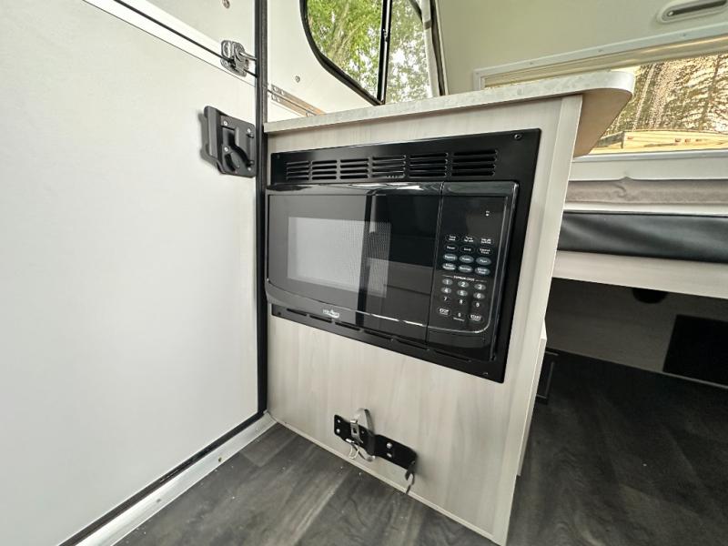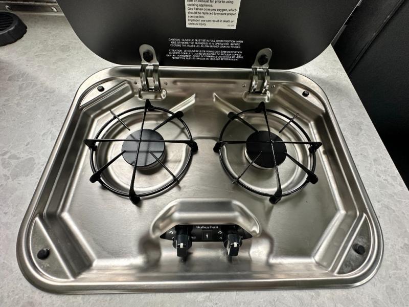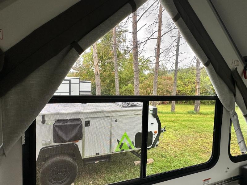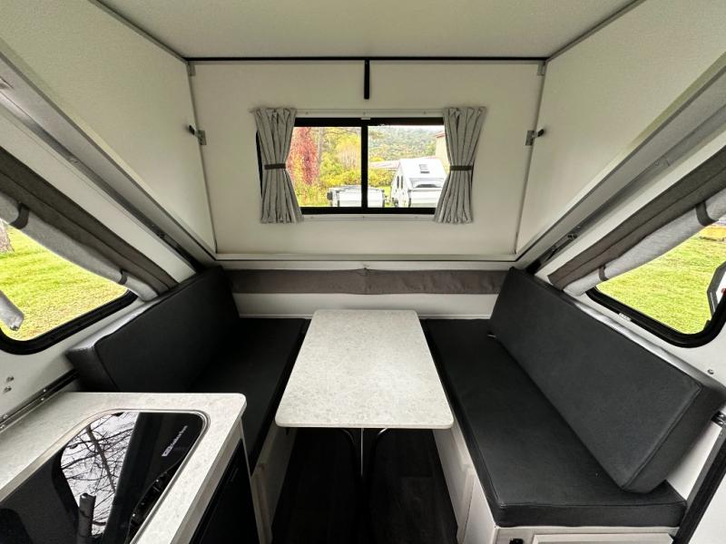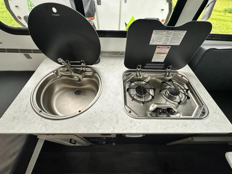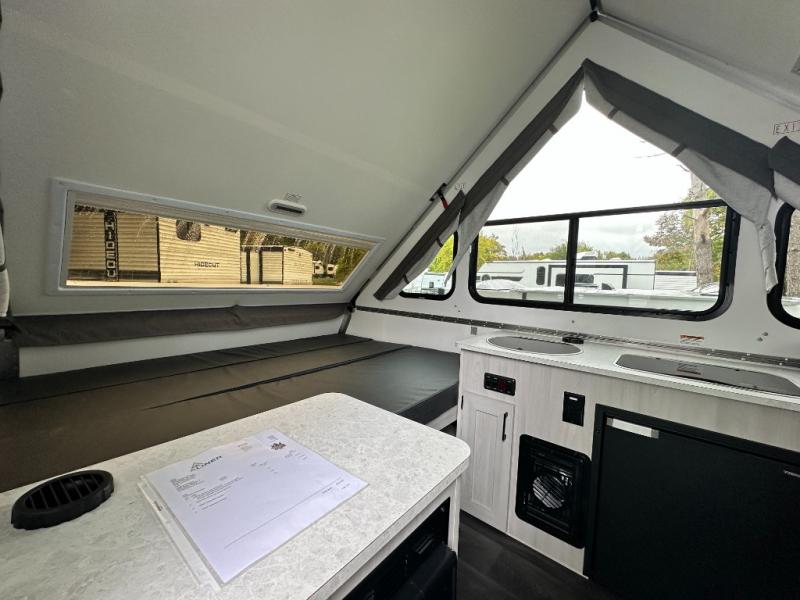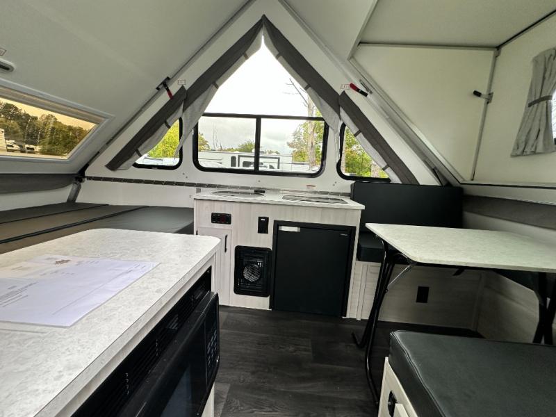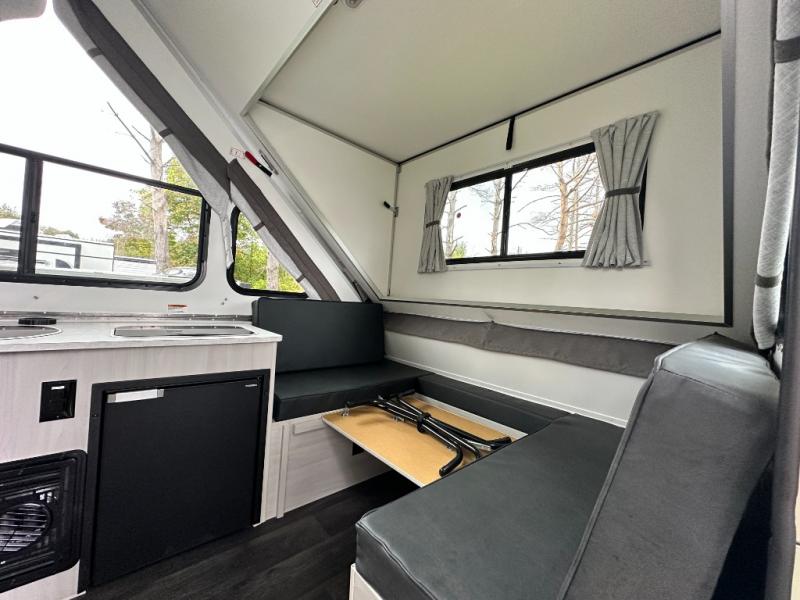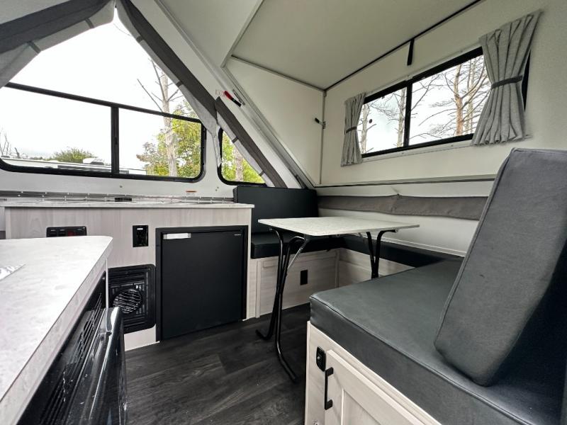 Camping has never been easier than in this A-frame camper. Once you arrive at your destination, grab your gear from the two exterior baggage doors, then head inside to make lunch on the two burner in/out stove. The sofa bed can convert to a 60" x 76" bed, and the dinette converts to a 46" x 76" bed for comfortable sleeping space at night. You will find under-dinette storage for your belongings, plus two shelves on either side of the sofa bed.