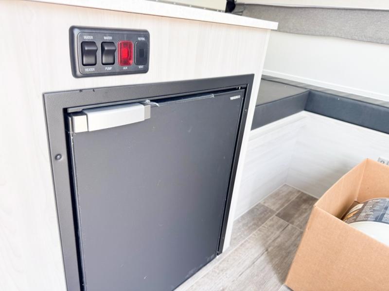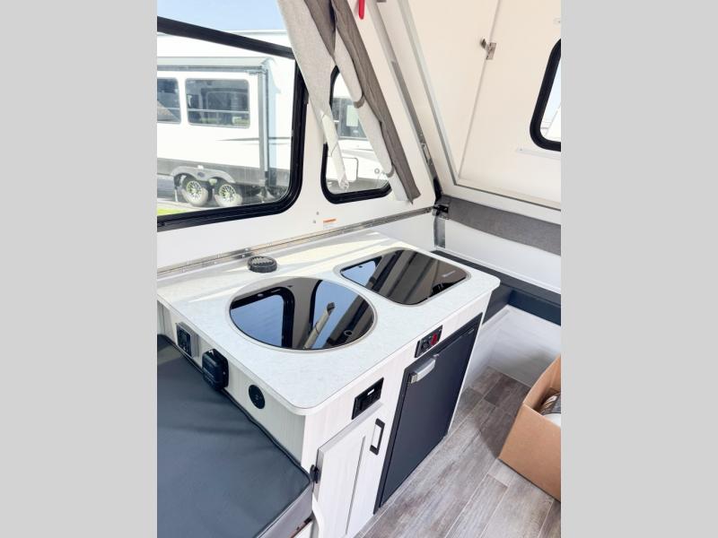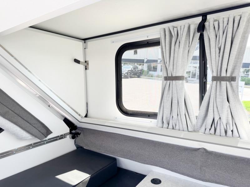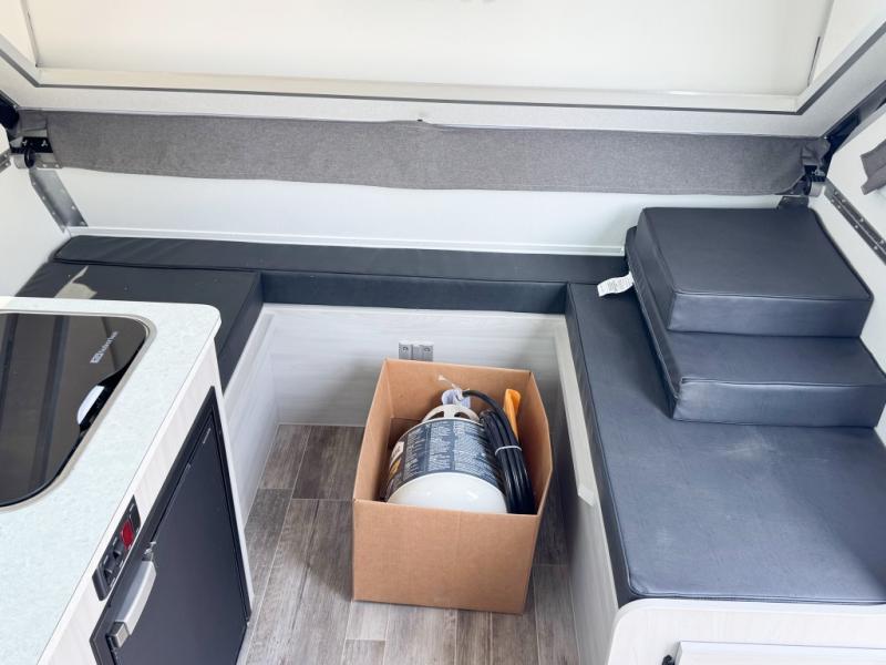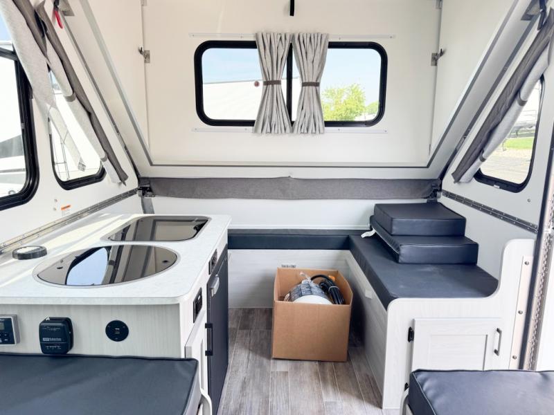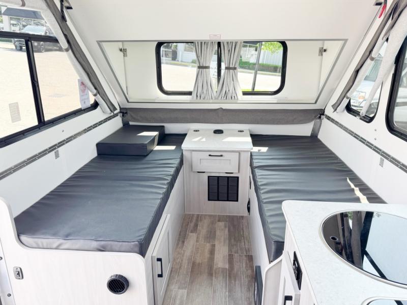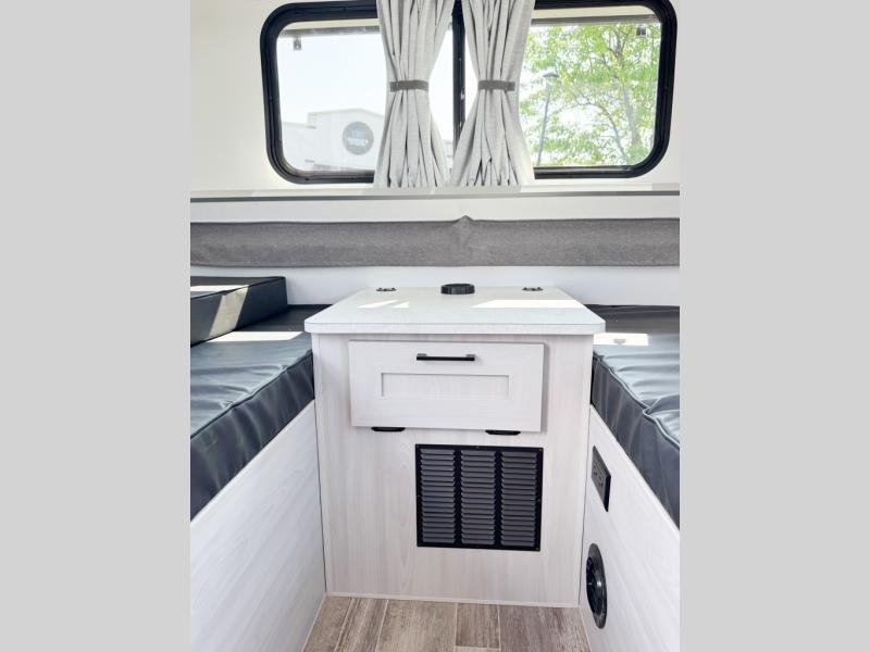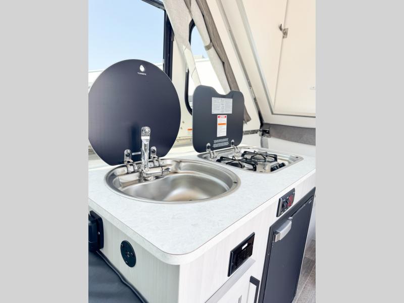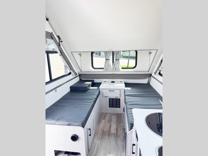 If you enjoy camping with friends or you need your own space at night, this Twin Bed model will do the trick! While two campers take the rear twin beds, the front booth dinette can convert to a 30" x 76" bed for an extra guest, and in the morning you can convert it back to dining space. Whip up breakfast on the two burner stove, or use the convenient microwave oven. There is also a sink to clean up your dishes plus a 3.1 cu. ft. 12V refrigerator to put milk and eggs back in. Don't let this cute A-Frame slip away!