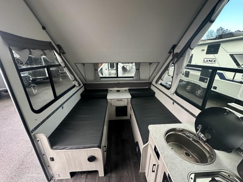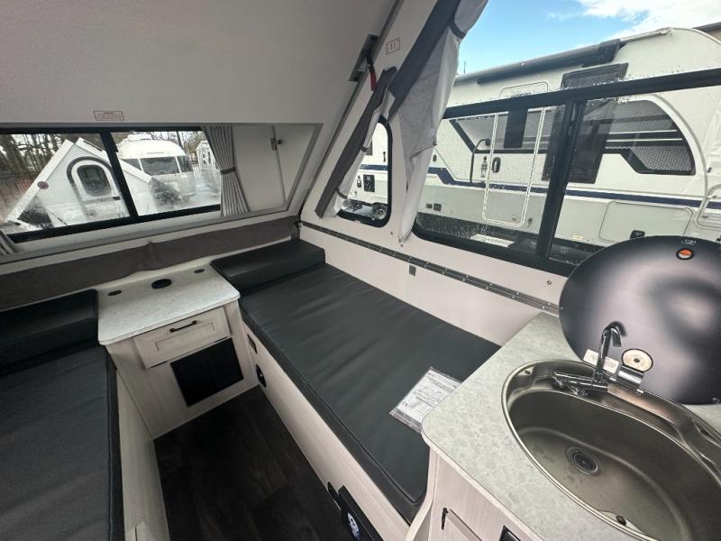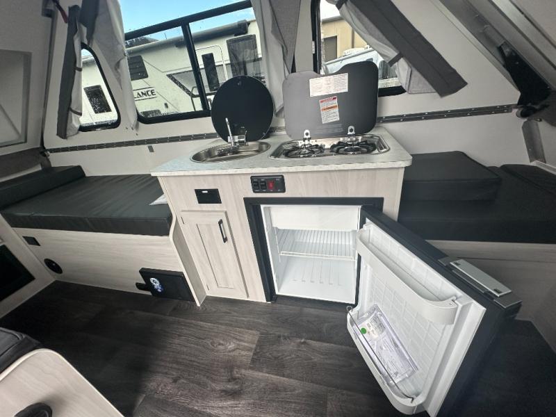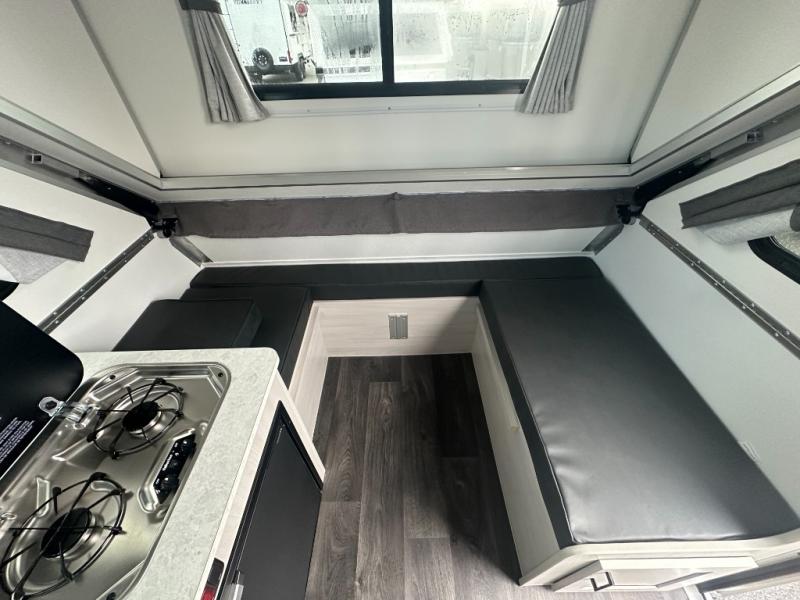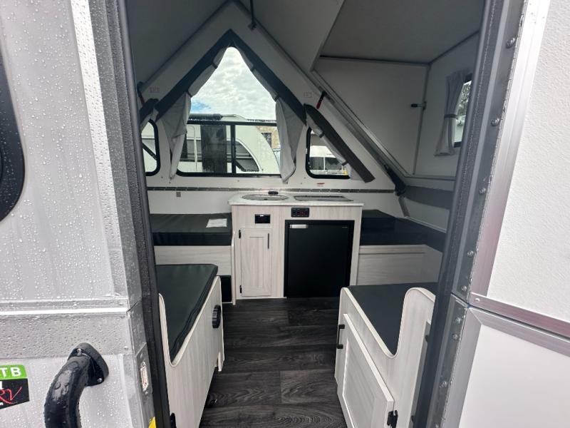 If you enjoy camping with friends or you need your own space at night, this Twin Bed model will do the trick! While two campers take the rear twin beds, the front booth dinette can convert to a 30" x 76" bed for an extra guest, and in the morning, you can convert it back to dining space. Whip up breakfast on the two-burner stove, and there is a sink to clean up your dishes plus a 3.2 cu. ft. 12V refrigerator to put milk and eggs back in. An optional rear hard dormer can be added on this model for even more interior space!