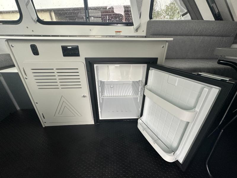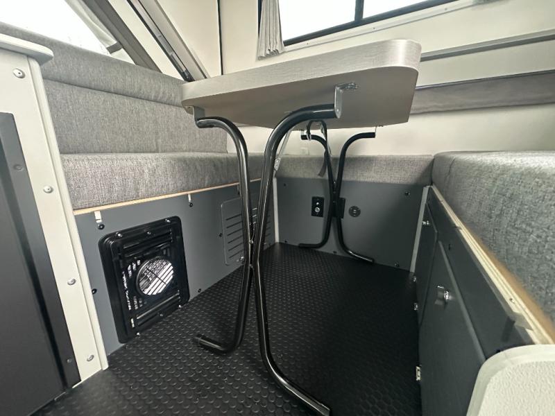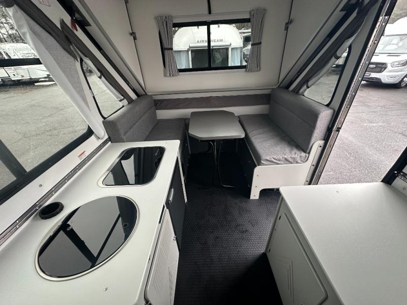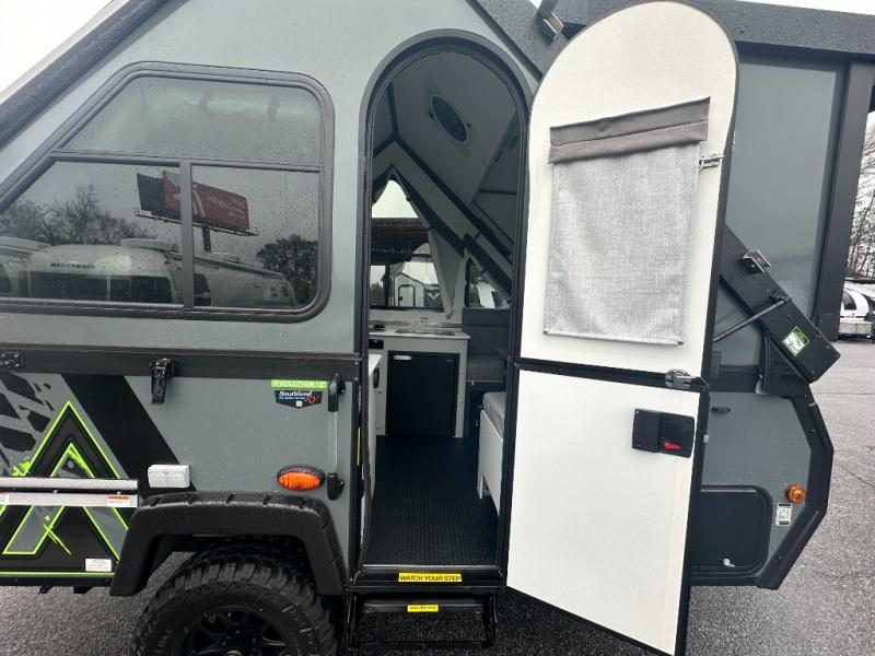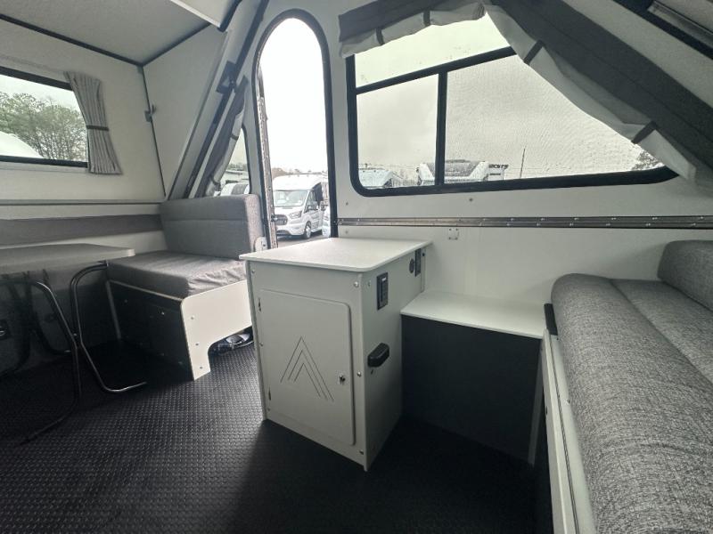 The Evolution A-frame camper by Aliner is coming to you with residential features and solid construction materials. You'll love the slate gray exterior, and the Azdel composite panels included help prolong the life of your camper. There are 15" off-road tires with graphics package, LED running lights, exterior baggage doors, plus many more exterior conveniences. The Evolution A-Frame camper comes with commercial grade, raised coin polyvinyl flooring, SIMONA BOATBOARD interior cabinets and furniture, and three indoor electrical outlets to name a few interior comforts.