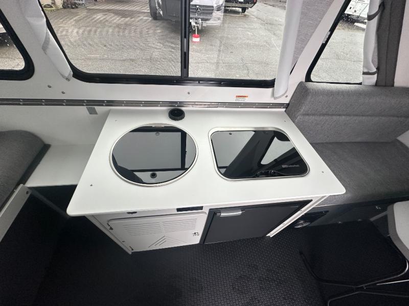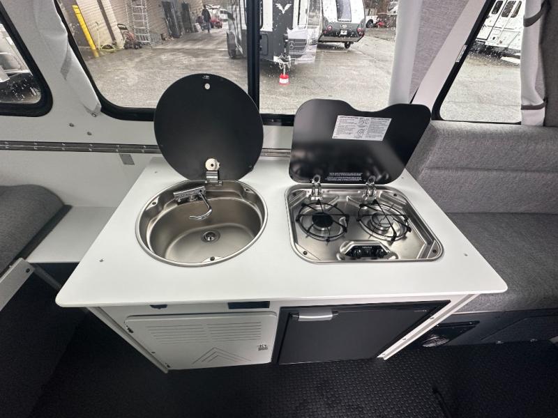 If you're looking for a lightweight camper that can sleep four, take a look at this Evolution 12! There is a sofa bed in the back that will convert to a 56" x 76" bed each night, and a dinette that converts to a 46" x 76" bed. In the morning you can prepare breakfast on the two-burner stove, clean up with the flush mount sink, and store cold items in the 3.0 cu. ft. 3.1 cu. ft. 12V refrigerator.