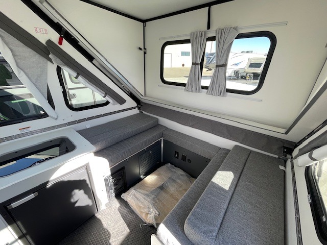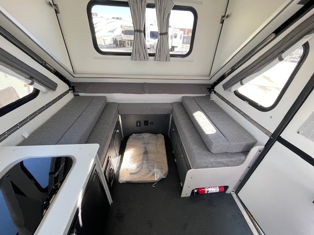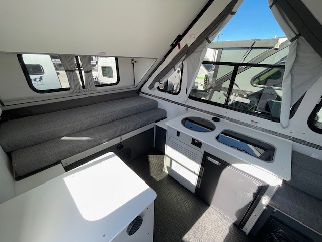 If you're looking for a lightweight camper that can sleep four, take a look at this Evolution 12! There is a sofa bed in the back that will convert to a 56" x 76" bed each night, and a dinette that converts to a 46" x 76" bed. In the morning you can prepare breakfast on the two-burner stove, clean up with the flush mount sink, and store cold items in the 3.2 cu. ft. 12V refrigerator.