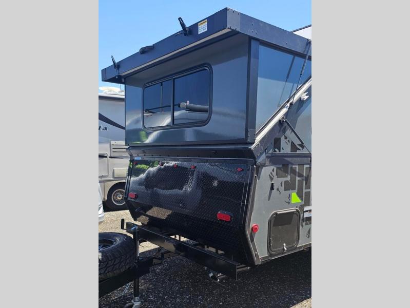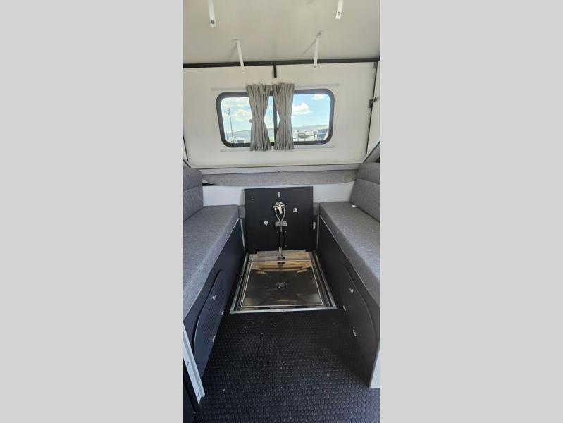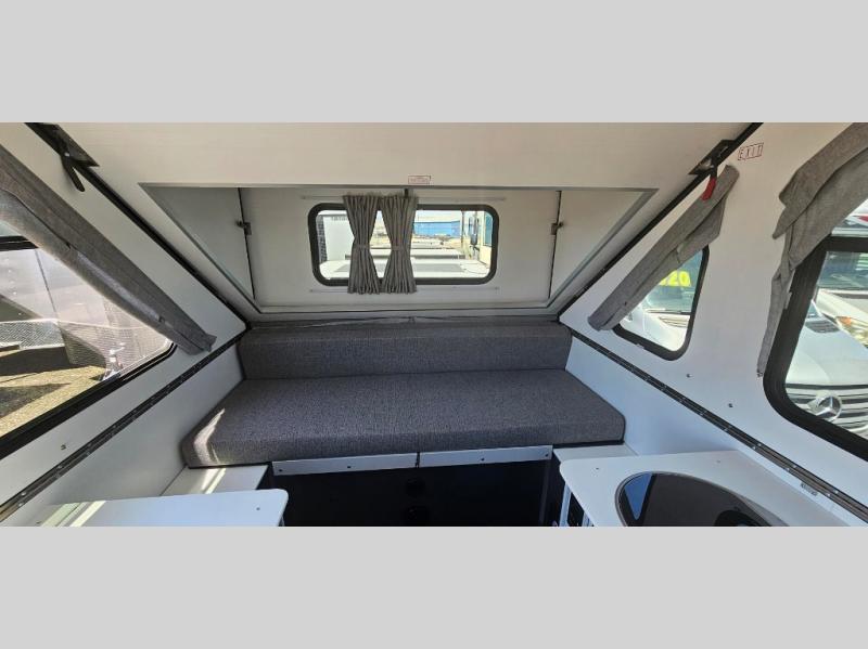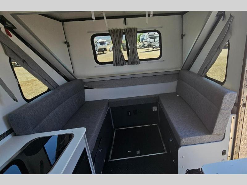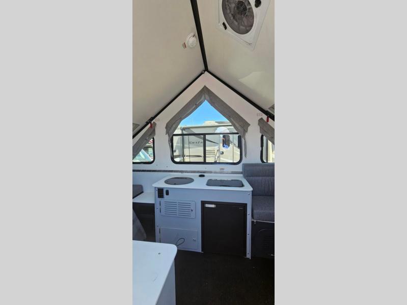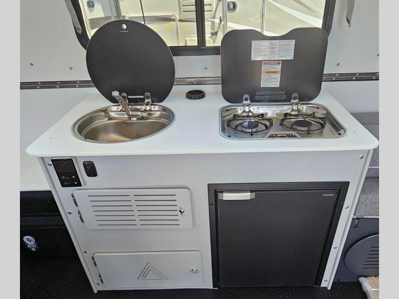 The Evolution A-frame camper by Aliner is coming to you with residential features and solid construction materials. You'll love the slate gray exterior, and the Azdel composite panels included help prolong the life of your camper. There are 15" off-road tires with graphics package, LED running lights, exterior baggage doors, plus many more exterior conveniences. The Evolution A-Frame camper comes with commercial grade, raised coin polyvinyl flooring, SIMONA BOATBOARD interior cabinets and furniture, and three indoor electrical outlets to name a few interior comforts.