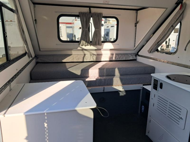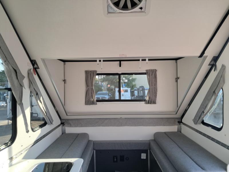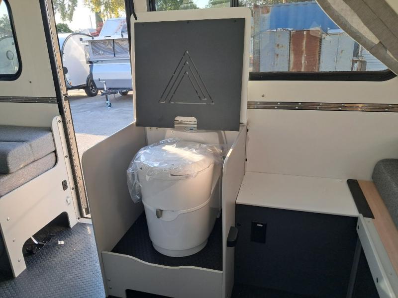 The Evolution A-frame camper by Aliner is coming to you with residential features and solid construction materials. You'll love the slate gray exterior, and the Azdel composite panels included help prolong the life of your camper. There are 15" off-road tires with graphics package, LED running lights, exterior baggage doors, plus many more exterior conveniences. The Evolution A-Frame camper comes with commercial grade, raised coin polyvinyl flooring, SIMONA BOATBOARD interior cabinets and furniture, and three indoor electrical outlets to name a few interior comforts.