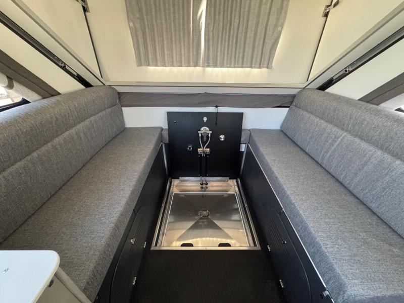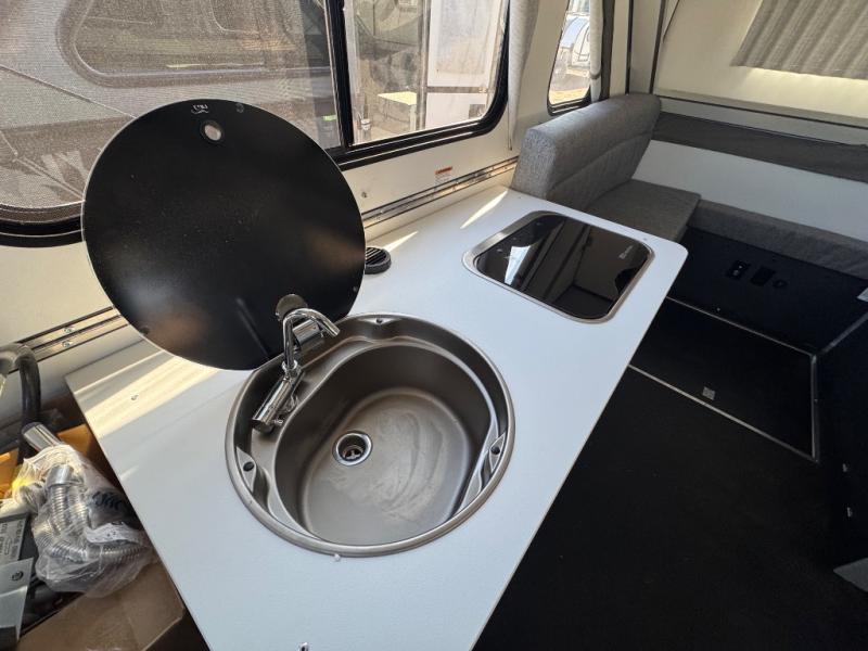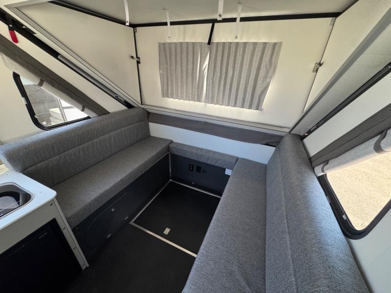 The Evolution A-frame camper by Aliner is coming to you with residential features and solid construction materials. You'll love the slate gray exterior, aluminum wheels, and the Azdel composite panels to help prolong the life of your camper. There are LED running lights, exterior baggage doors, and four stabilizer jacks to help keep your camper secure. You will also appreciate the keyless entry, the dual LP tanks with a cover, and the 200-watt solar panel on the front dormer for some off-grid power. The lift kit and 15" off-road tires add 3" to the height, allowing you to explore more roads, and you'll find many interior comforts to make you feel right at home!