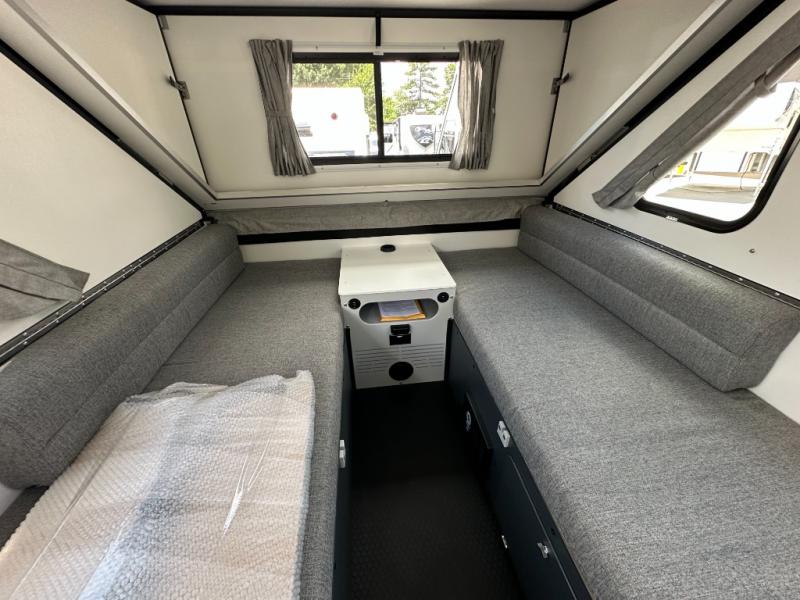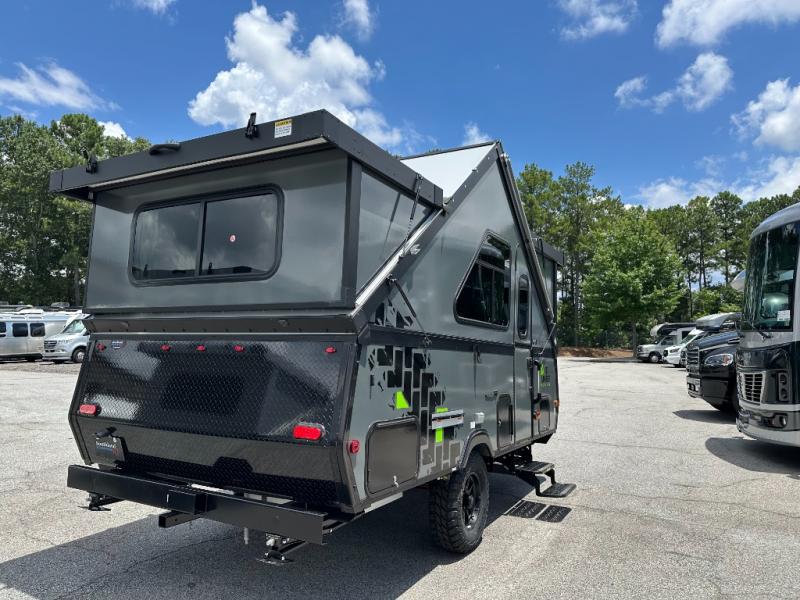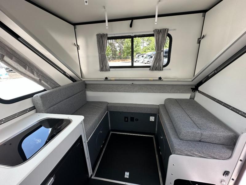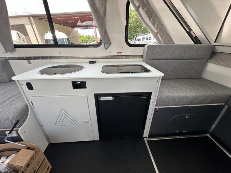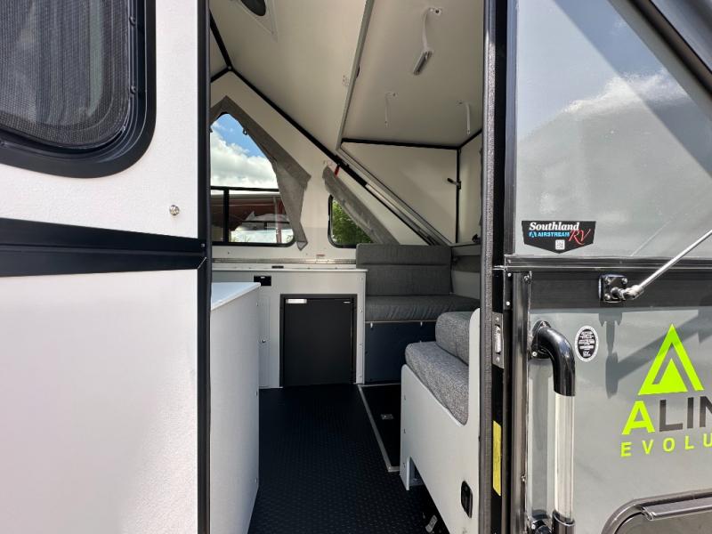 The Evolution A-frame camper by Aliner is coming to you with residential features and solid construction materials. You'll love the slate gray exterior, and the Azdel composite panels included help prolong the life of your camper. There are 15" off-road tires with graphics package, LED running lights, exterior baggage doors, plus many more exterior conveniences. The Evolution A-Frame camper comes with commercial grade, raised coin polyvinyl flooring, SIMONA BOATBOARD interior cabinets and furniture, and three indoor electrical outlets to name a few interior comforts.