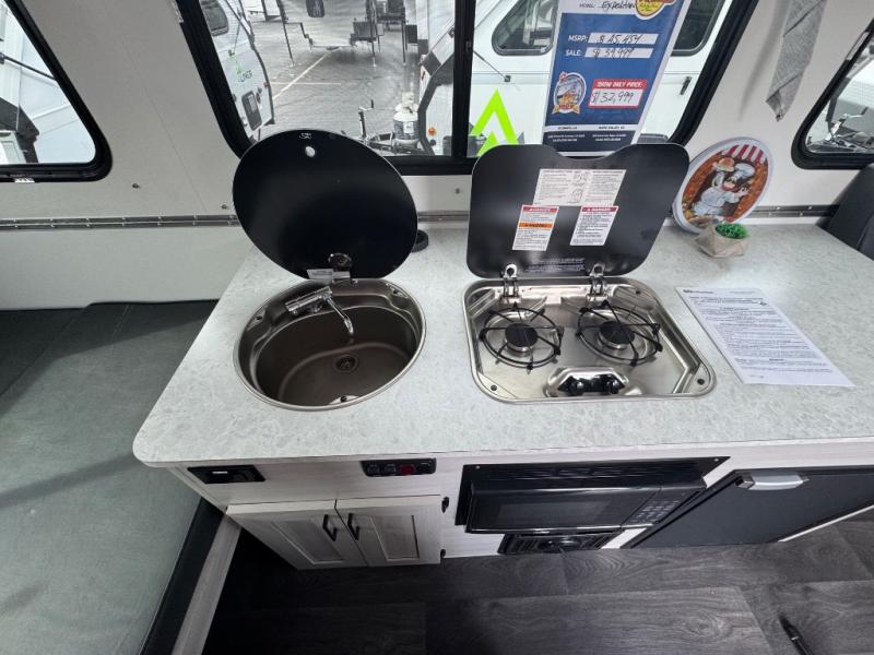 comes equipped with 2 range stove top with glass cover , 9000 Btu ac with heat pump , furnace , outside shower , water heater 6gallons , and dual hard dormers that maximizes your space!