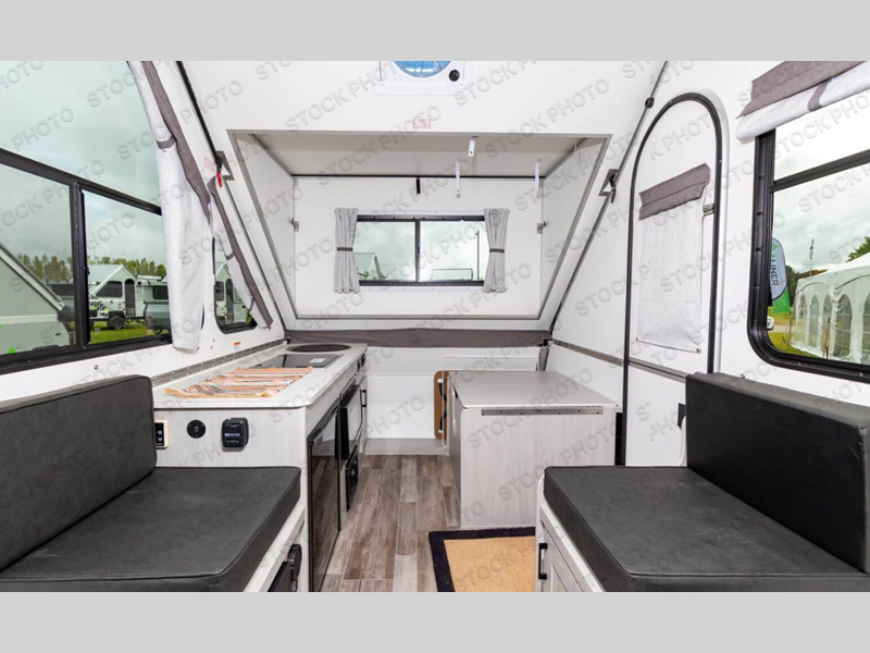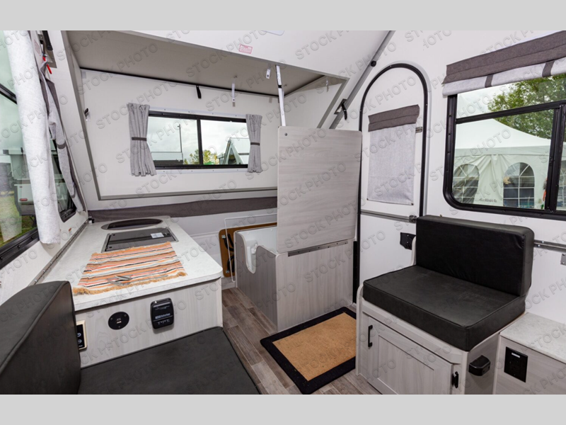 Versatile, comfortable, and convenient indoor living while camping can be found throughout this camper! The shower with a cassette toilet offers convenience and a place to clean up each morning, the 3.1 cu. ft. 12V refrigerator offers cold storage, and the microwave plus two burner stove allows you to make warm meals. Eat your meals while sitting on the sofa bed or at the dinette with two seats. And the sofa bed converts into an 74" x 76" bed for a great night's rest!