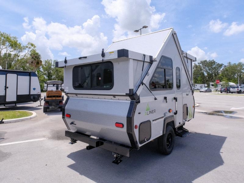 The LXE A-frame camper by Aliner construction includes Azdel lightweight, and vacuum bonded fiberglass panels for durability. Some extra features include an outside shower, LED running lights, additional corner windows, and an exterior propane connection if you want to hook up a grill. Inside, there are real hardwood cabinet doors, LED lights, plus three interior electrical outlets to keep the electronics charged.