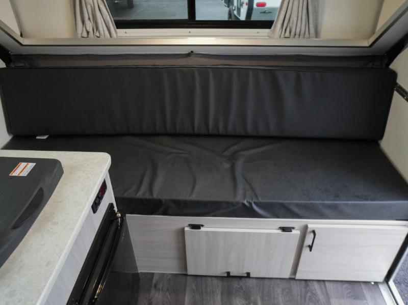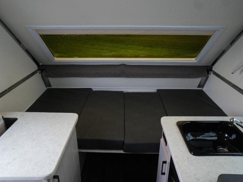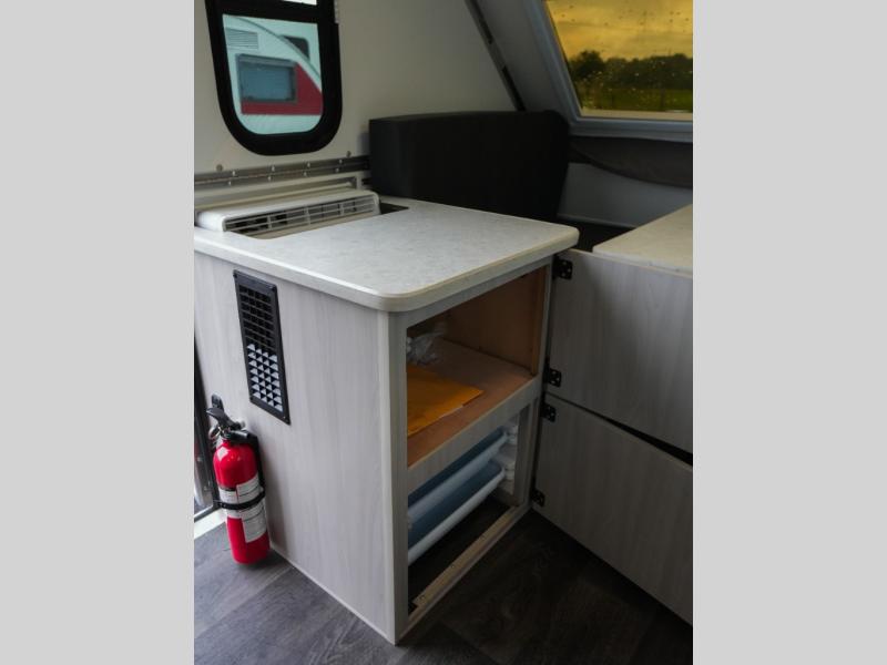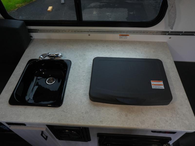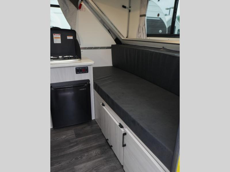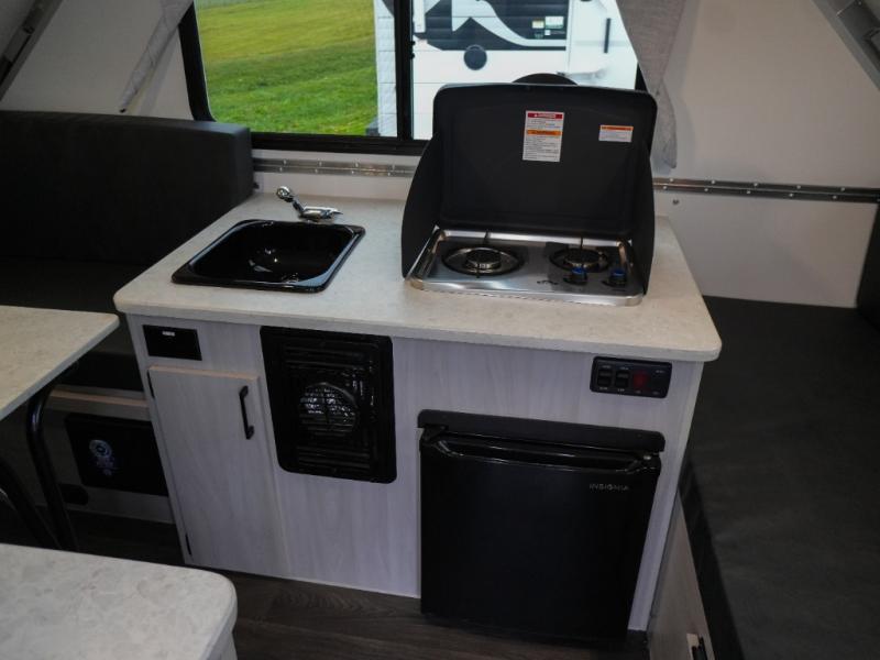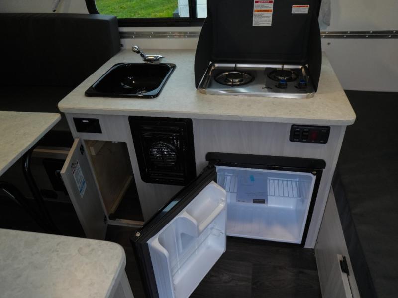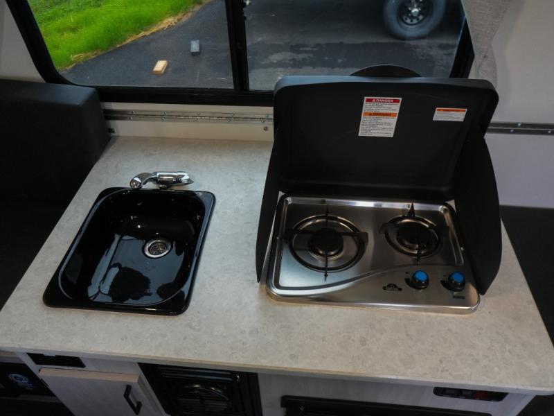 Whether you camp solo or with your friend, you will have all the accommodations you need to enjoy the outdoors, and sleep as well as cook indoors! The front 30" x 76" bed or the rear dinette that can be converted into a 40" x 76" bed give you choices each night. You will appreciate the storage under the bed and the extra storage area across from the kitchen. There is a two burner stove to make a warm meal, a sink to wash your dishes, and a 1.7 cu. ft. 12V refrigerator for your perishables. And don't forget to charge your cellphone using one of the interior or exterior outlets.