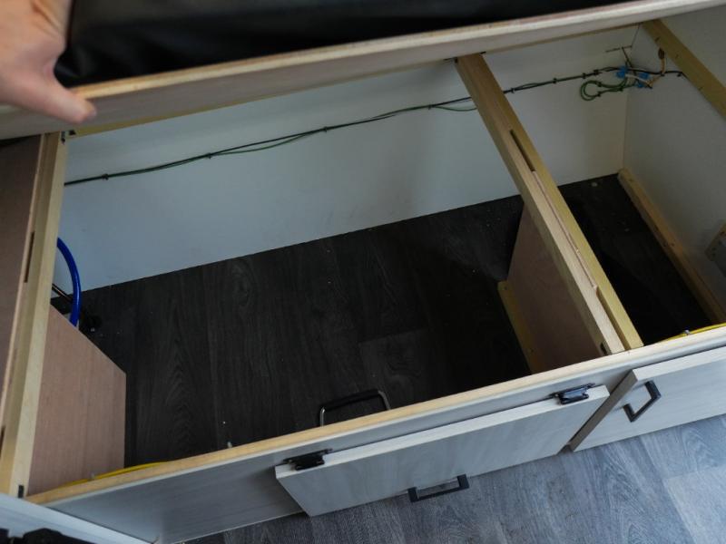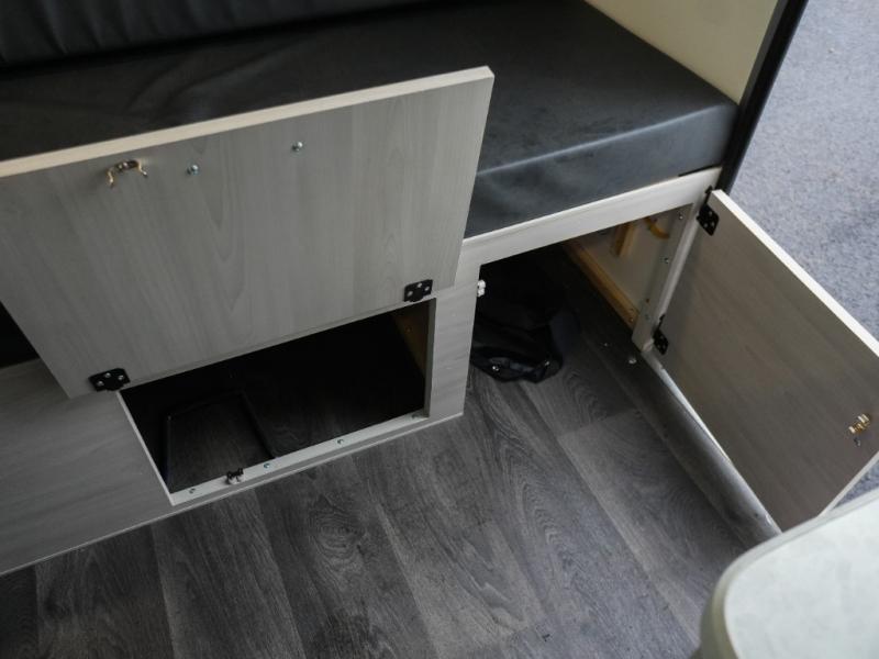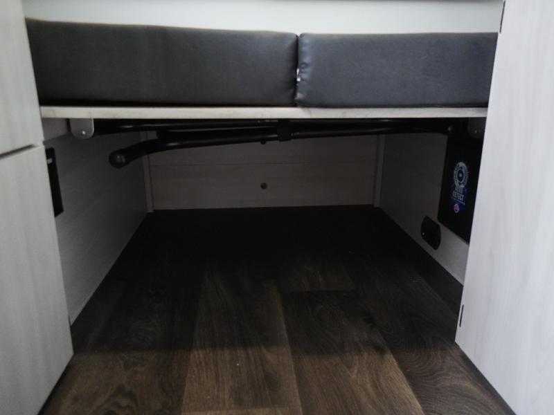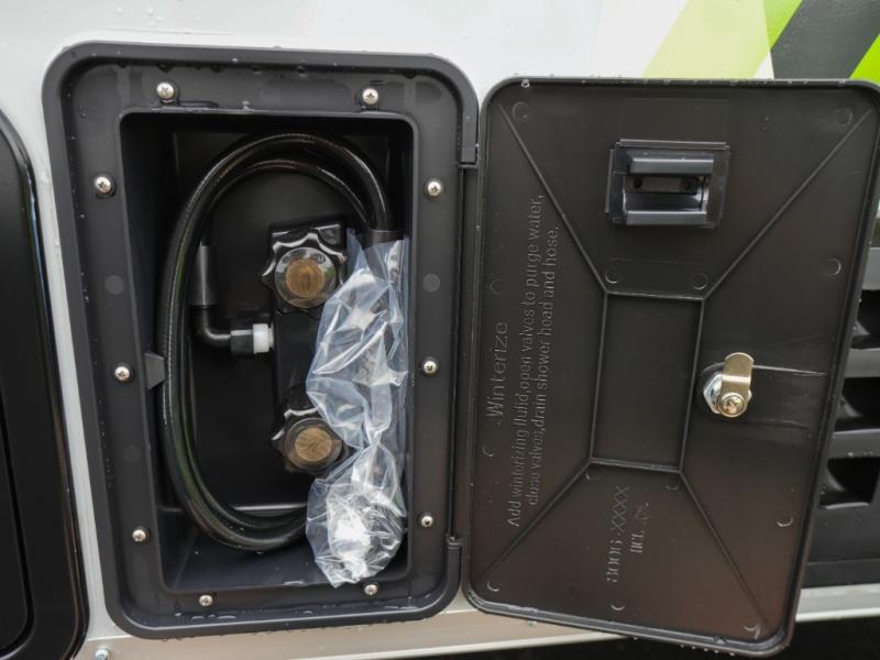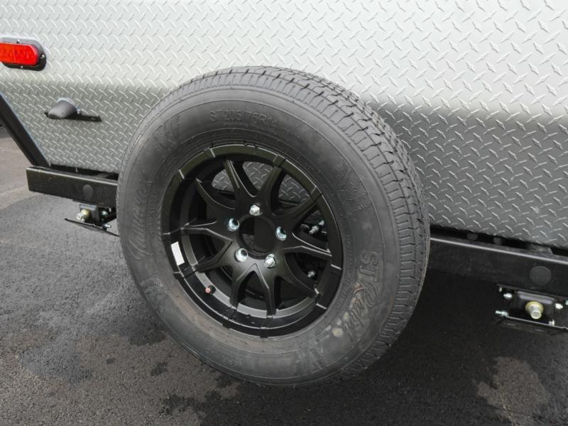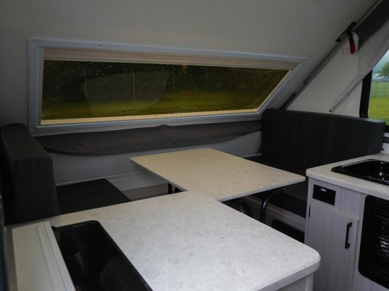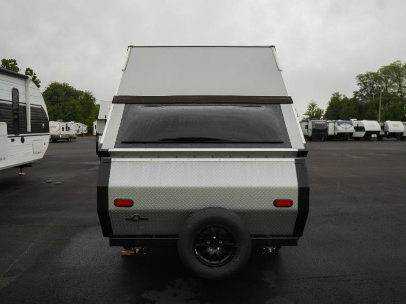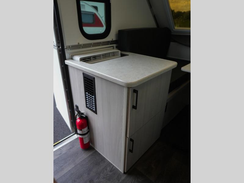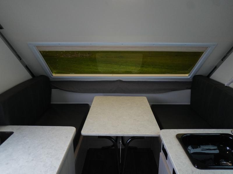 Whether you camp solo or with your friend, you will have all the accommodations you need to enjoy the outdoors, and sleep as well as cook indoors! The front 30" x 76" bed or the rear dinette that can be converted into a 40" x 76" bed give you choices each night. You will appreciate the storage under the bed and the extra storage area across from the kitchen. There is a two burner stove to make a warm meal, a sink to wash your dishes, and a 1.7 cu. ft. 12V refrigerator for your perishables. And don't forget to charge your cellphone using one of the interior or exterior outlets.