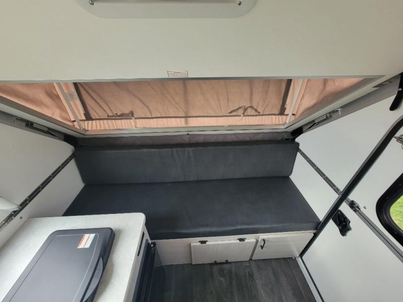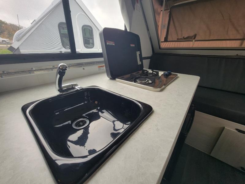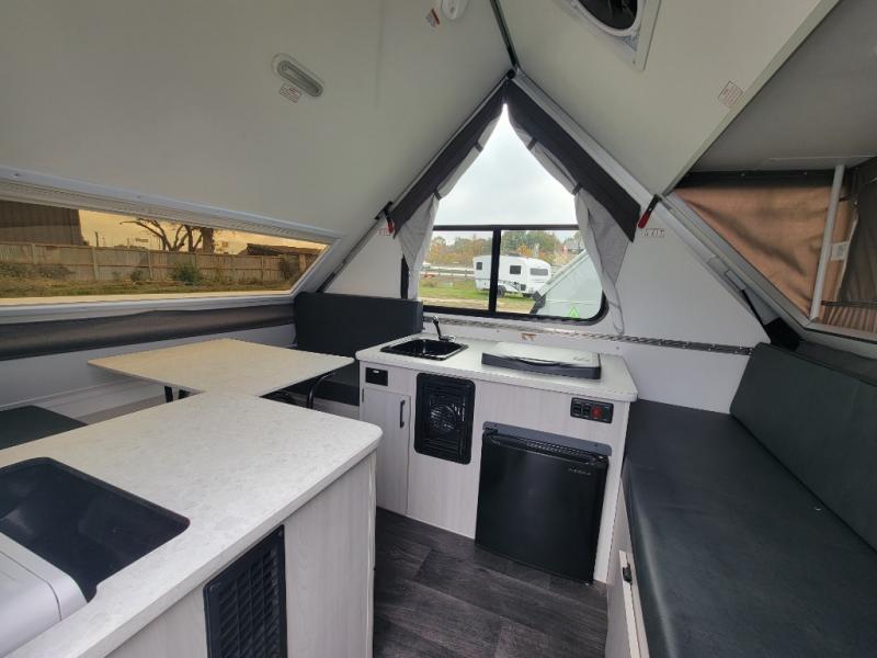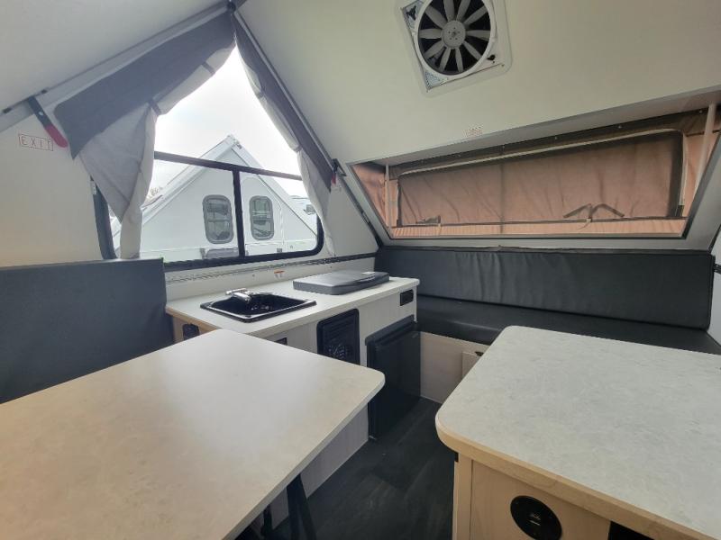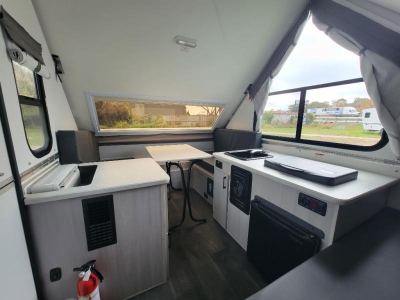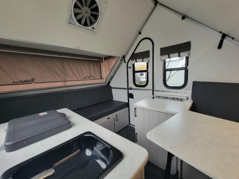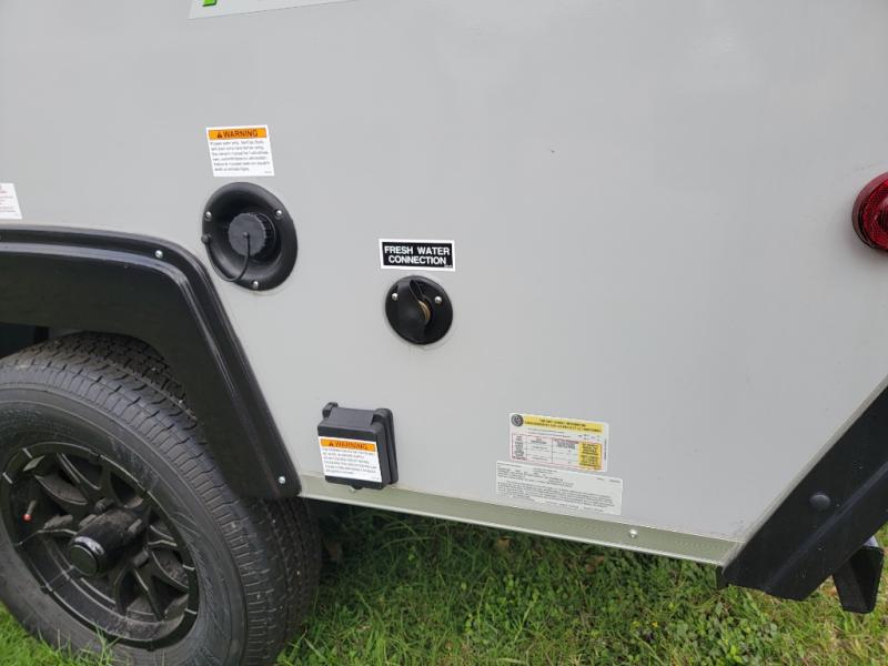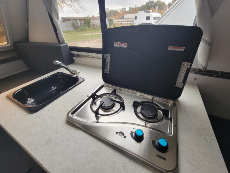 Whether you camp solo or with your friend, you will have all the accommodations you need to enjoy the outdoors, and sleep as well as cook indoors! The front 30" x 76" bed or the rear dinette that can be converted into a 40" x 76" bed give you choices each night. You will appreciate the storage under the bed and the extra storage area across from the kitchen. There is a two burner stove to make a warm meal, a sink to wash your dishes, and a 1.7 cu. ft. 12V refrigerator for your perishables. And don't forget to charge your cellphone using one of the interior or exterior outlets.