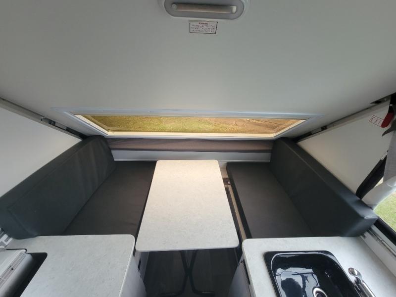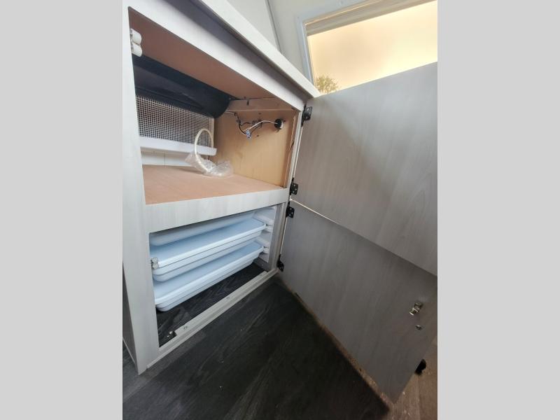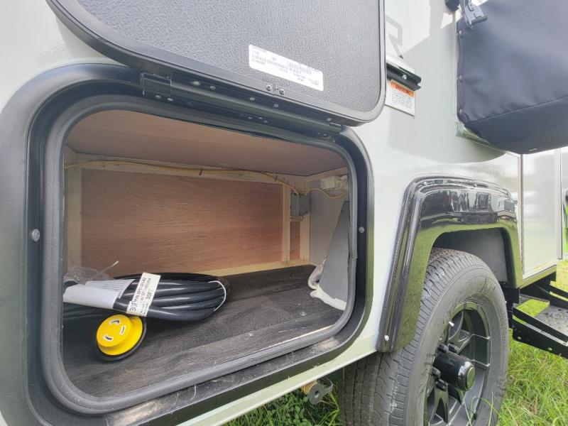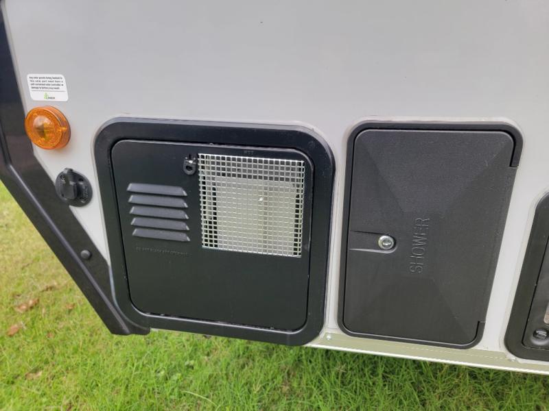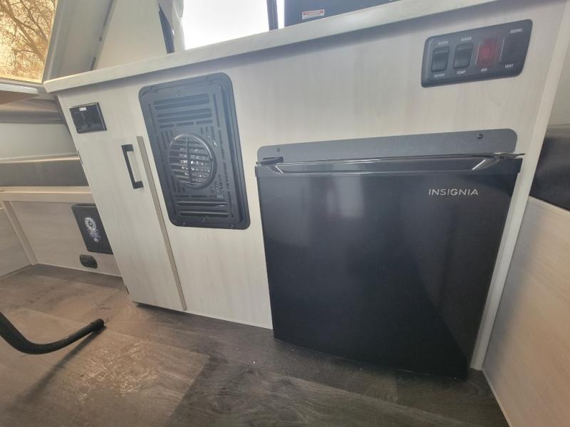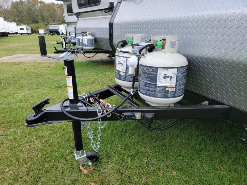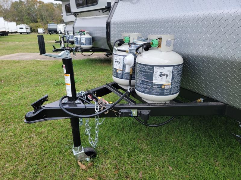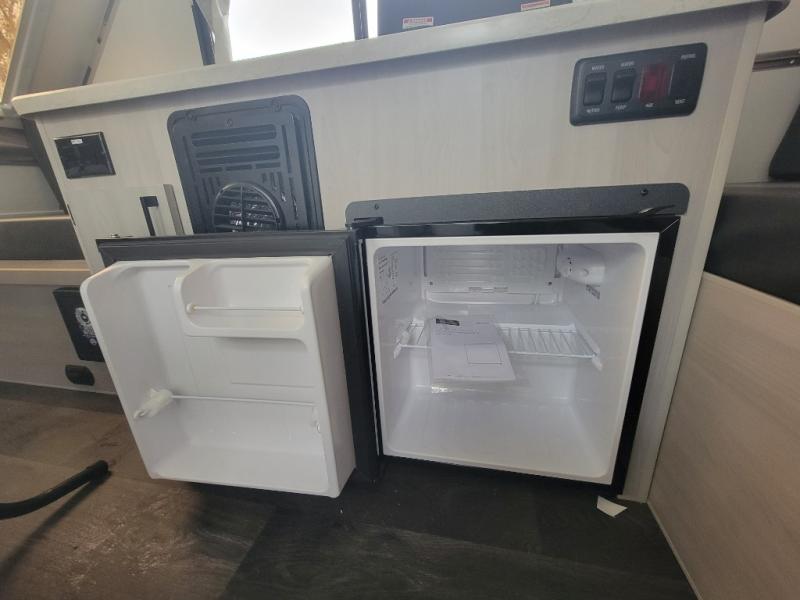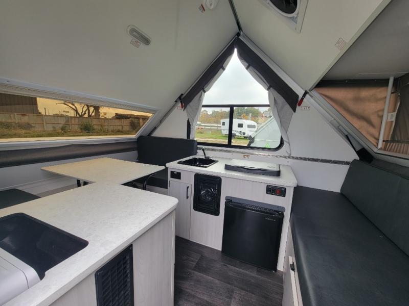 Whether you camp solo or with your friend, you will have all the accommodations you need to enjoy the outdoors, and sleep as well as cook indoors! The front 30" x 76" bed or the rear dinette that can be converted into a 40" x 76" bed give you choices each night. You will appreciate the storage under the bed and the extra storage area across from the kitchen. There is a two burner stove to make a warm meal, a sink to wash your dishes, and a 1.7 cu. ft. 12V refrigerator for your perishables. And don't forget to charge your cellphone using one of the interior or exterior outlets.