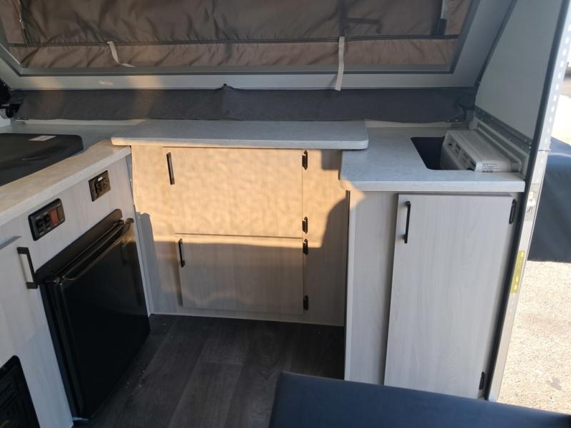 When you only need sleeping space for one or two, enjoy making last minute plans, and prefer your everyday vehicle to do your towing, this camper makes sense! The front kitchen makes it easy to walk around as you prepare meals using the two burner stove and sink, and there is more counterspace plus extra storage near the entry, and there is a 1.7 cu. ft. 12V refrigerator. The rear dinette converts into a 40" x 76" bed so you can utilize this space for dining and sleeping space!