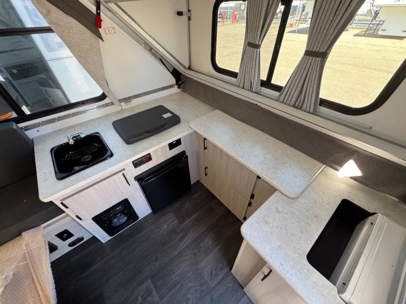 When you only need sleeping space for one or two, enjoy making last minute plans, and prefer your everyday vehicle to do your towing, this camper makes sense! The front kitchen makes it easy to walk around as you prepare meals using the two-burner stove and sink, and there is more counter space plus extra storage near the entry. And you'll appreciate the 1.7 cu. ft. 12V refrigerator for food storage. The rear dinette converts into a 40" x 76" bed so you can utilize this space for dining and sleeping space!