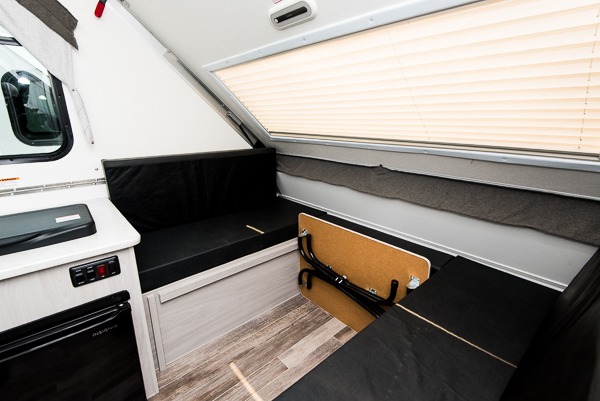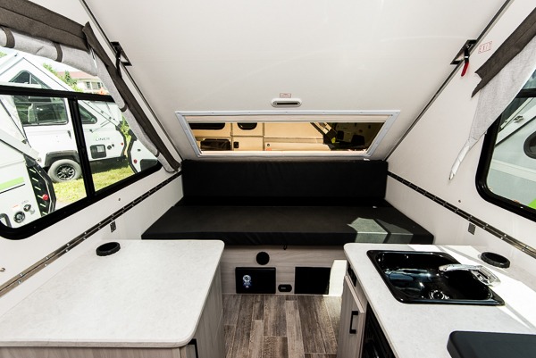Looking for a camper that you can relax and unwind inside when you aren't exploring outdoors? Need sleeping space for two or three? Well the rear sofa bed in this camper converts into a 56" x 76" bed and the front dinette converts into a 46" x 76" bed. You can prepare delicious meals with the two burner stove, clean up with the sink, and keep your perishables fresh within the 1.7 cu. ft. 12V refrigerator underneath the stove and sink. You might even like to add an optional soft or hard dormer to the front or rear of this unit, and/or the optional Off Road package.