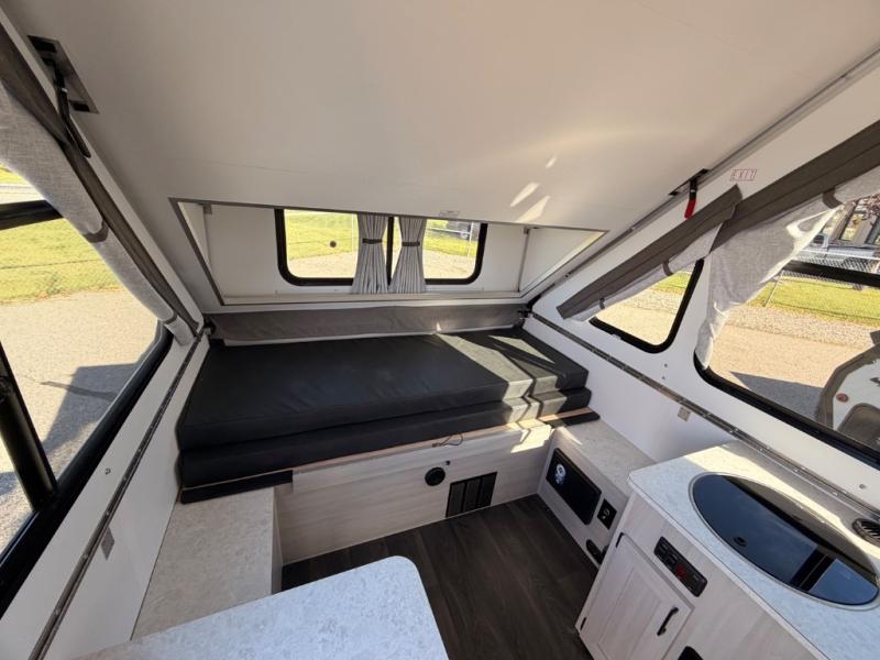 Looking for a camper that you can relax and unwind inside when you aren't exploring outdoors? Need sleeping space for two or three? Well the rear sofa bed in this camper converts into a 56" x 76" bed and the front dinette converts into a 46" x 76" bed. You can prepare delicious meals with the two burner stove, clean up with the sink, and keep your perishables fresh within the 1.7 cu. ft. 12V refrigerator underneath the stove and sink. You might even like to add an optional soft or hard dormer to the front or rear of this unit, and/or the optional Off Road package.